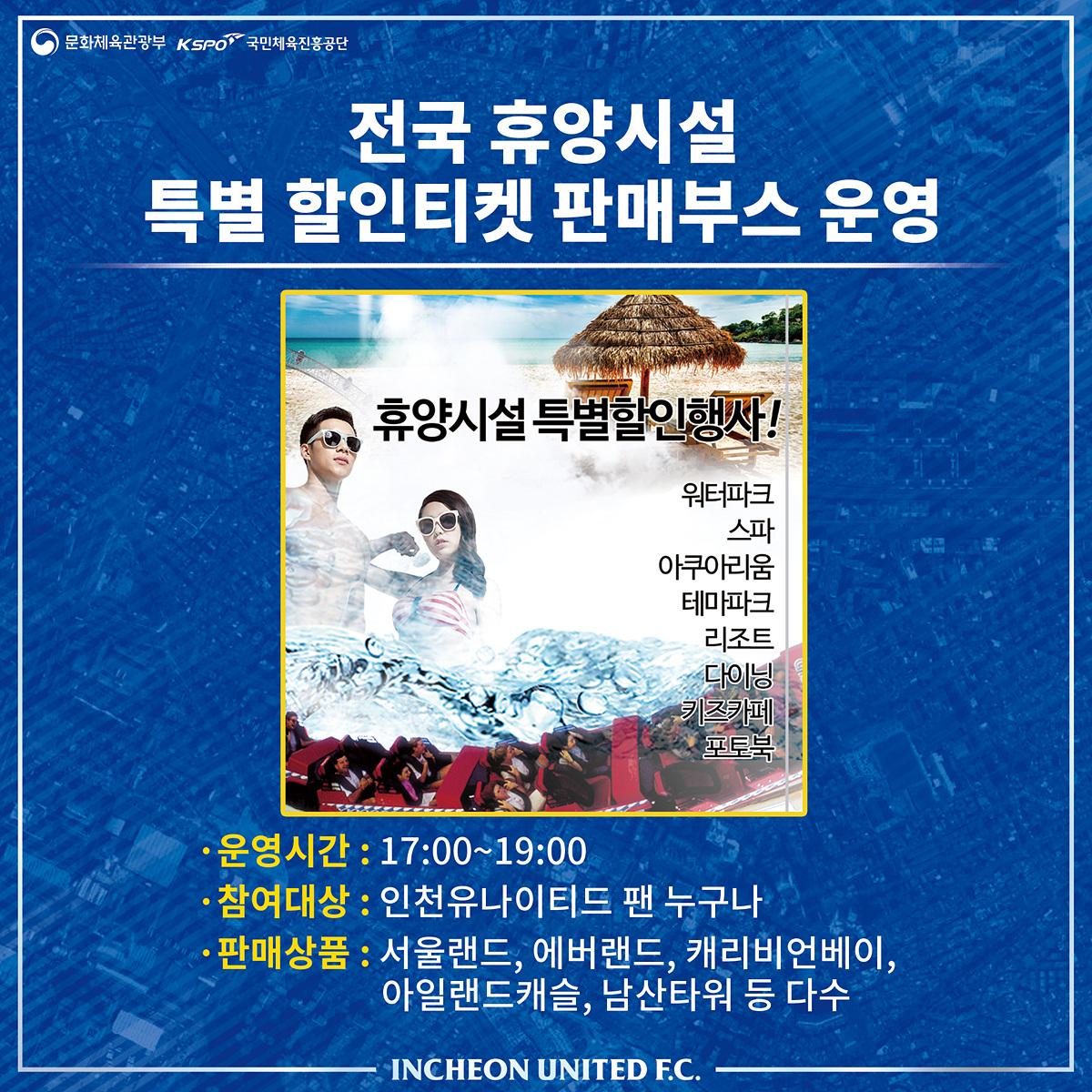 오직 인천 팬 여러분들께만 제공되는 전국 휴양시설 특별 할인 프로모션! 윈앤티켓이 준비한 특별할인을 북측 광장 전용 부스에서 만나보세요.