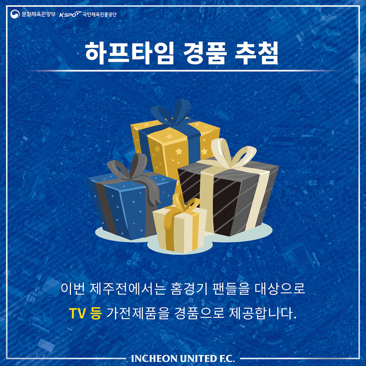 “행운의 주인공이 되어 보세요!” 제주전 홈경기 관람객을 대상으로 한 특별 이벤트! 추첨을 통해 TV 등 가전제품 경품을 제공합니다. 인천 팬 여러분의 관심과 참여를 부탁드립니다.