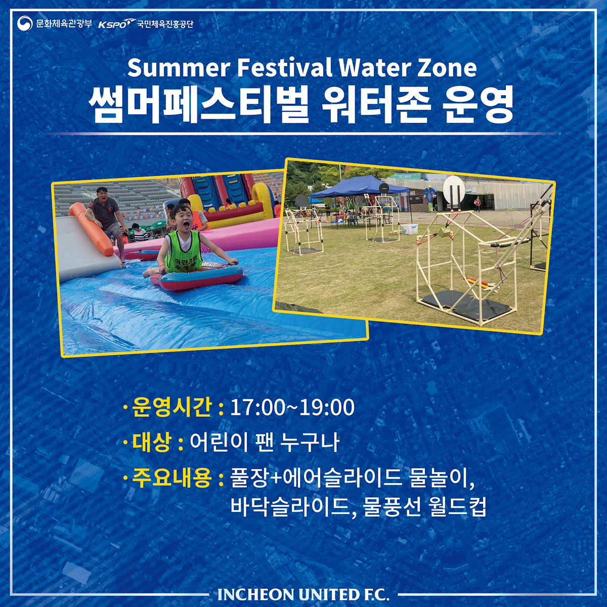 신나는 물놀이 잔치가 다시 돌아왔습니다! 인천유나이티드는 이번 제주전 홈경기에서 지난 서울, 성남전에 이어 세 번째로 ‘썸머페스티벌 워터존’을 운영합니다. 무더운 여름철 온 가족이 다 함께 즐길 수 있는 워터존에서 더위를 날리시길 바랍니다. 인천 시민이 다 함께 즐기는 축제 한 마당이 될 수 있도록 팬 여러분의 많은 관심 부탁드립니다.
