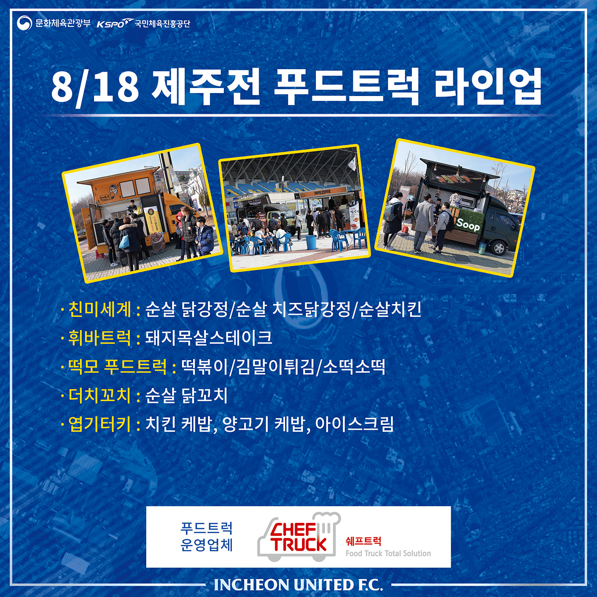 인천유나이티드 팬들의 입을 즐겁게 해주는 푸드트럭! 2019시즌에는 ‘쉐프트럭’과 함께하고 있습니다. 이번 제주전 홈경기에 찾아오는 푸드트럭의 메뉴 및 가격은 아래를 참고해주세요!