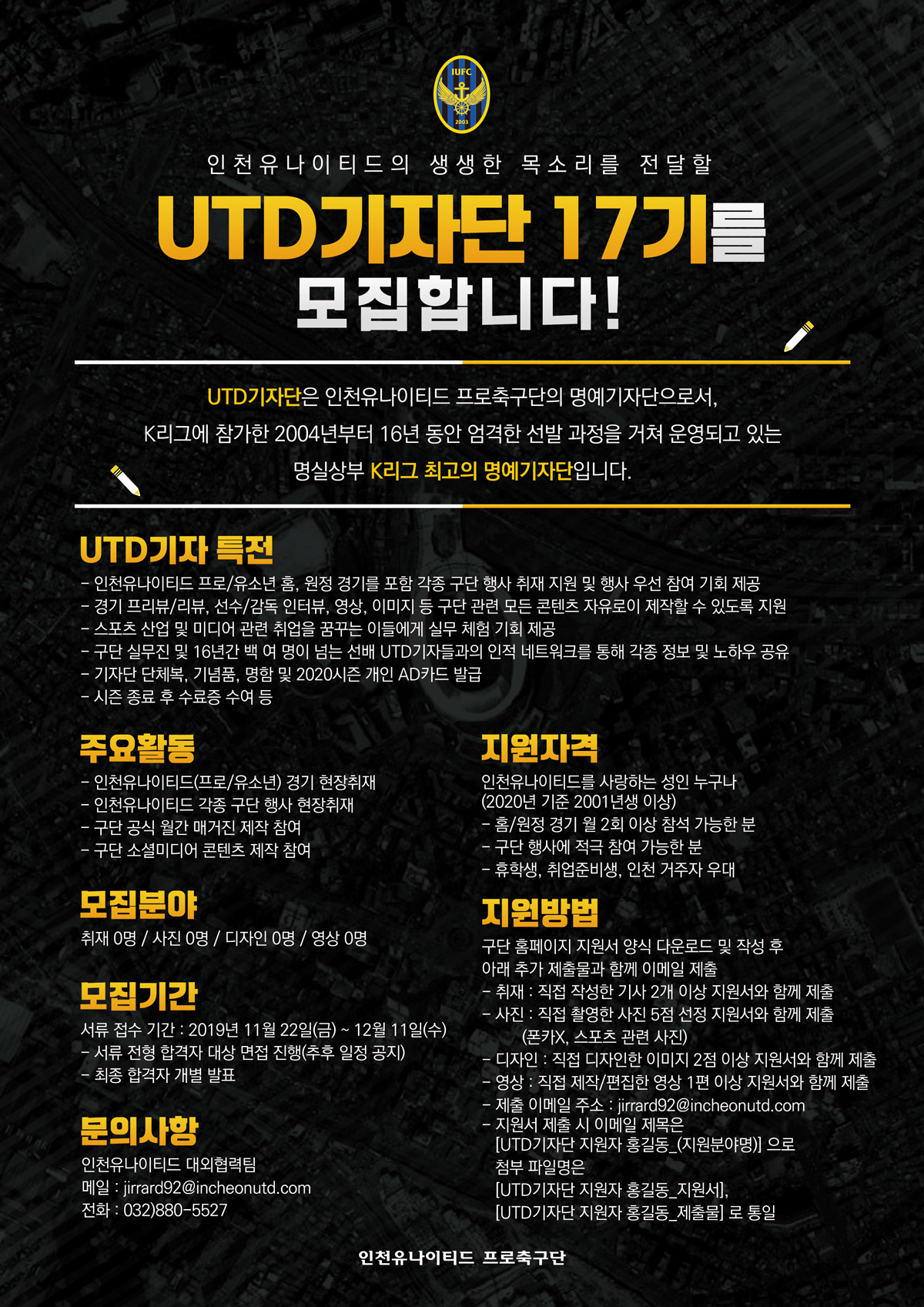 인천유나이티드 프로축구단과 2020시즌을 함께 할 UTD기자단 17기를 모집합니다.