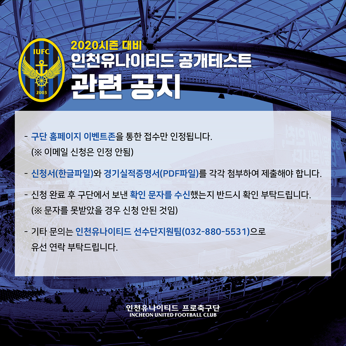 현재 2020시즌 대비 인천유나이티드 프로축구단 공개테스트 지원서가 구단 이메일로 접수되는 사례가 빈번히 발생되고 있습니다.
