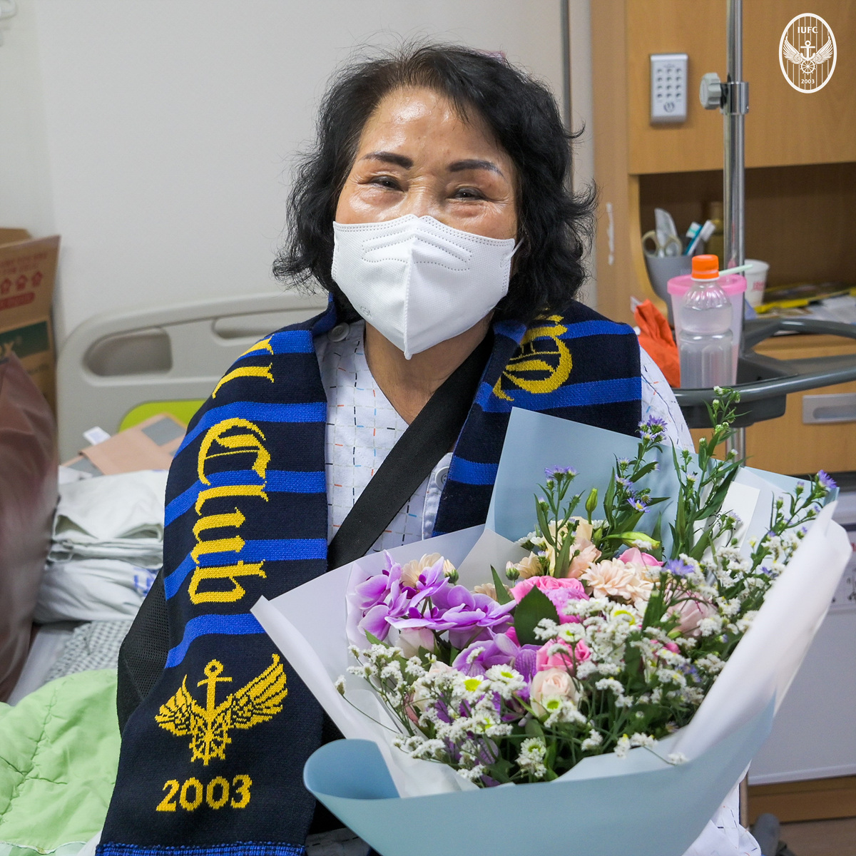 <사진1> 지난 2일 인천유나이티드 프로축구단은 남동구에 위치한 국제바로병원을 방문해 수술을 마치고 회복 중인 ‘한 골의 행복’ 첫 번째 수혜자 하용자 씨(78)를 만나 응원을 전하는 시간을 가졌다. 사진은 인천 구단이 준비한 꽃다발과 스카프를 들고 환하게 웃는 하 씨.