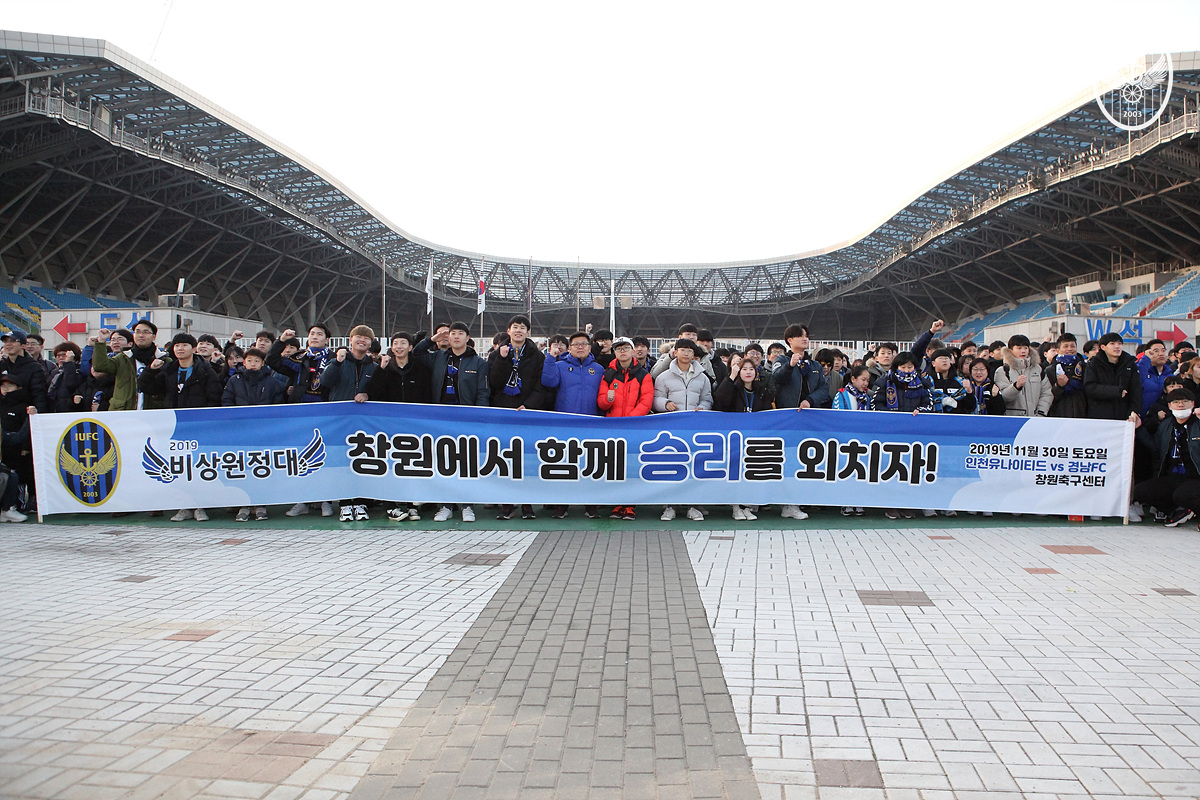 <사진2> 인천유나이티드 비상원정대가 지난 2019년 11월 30일 ‘하나원큐 K리그 1 2019’ 마지막 38라운드 원정경기를 앞두고 인천축구전용경기장 북측광장에서 기념 사진을 촬영하고 있다. 이날 비상원정대 역사상 최다인 16대의 버스, 천여 명의 원정대가 동참해 팀의 극적인 K리그 1 잔류를 도운 바 있다.이에 인천 구단은 화답 차원에서 파이널라운드 모든 원정경기에 무료 원정 버스를 운영하고, 원정 응원단 ‘비상원정대’를 모집하기로 했다. 비상원정대는 지난 2005년 K리그 준우승의 기운을 되새겨 다시 한번 비상하자는 의미를 담은 명칭이다. 2015년 FA컵 결승전을 앞두고 처음 모집된 비상원정대는 코로나19로 운영되지 않았던 2년을 제외하곤 4년간 인천의 시즌 막판 저력에 크게 이바지했다. 특히 2019시즌 최종전에서는 사상 최다 16대의 버스, 천여 명의 원정대가 동참해 팀의 극적인 잔류를 도운 바 있다. 올해 인천은 K리그 1 잔류가 아닌, 비상원정대와 아시아챔피언스리그 도전의 역사를 함께 쓸 정도로 성장했다.