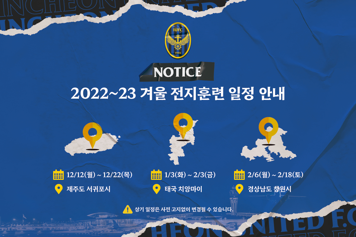 인천 구단은 ACL에 도전하는 2023시즌을 앞두고 오는 12월 12일부터 제주 서귀포를 시작으로 1월 태국 치앙마이, 2월 경남 창원 일대로 전지훈련을 떠난다고 16일 밝혔다.