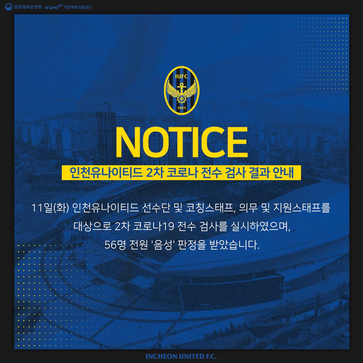 56명 전원이 '음성' 판정을 받았습니다.INCHEON UNITEDMEDIA FEEDS
