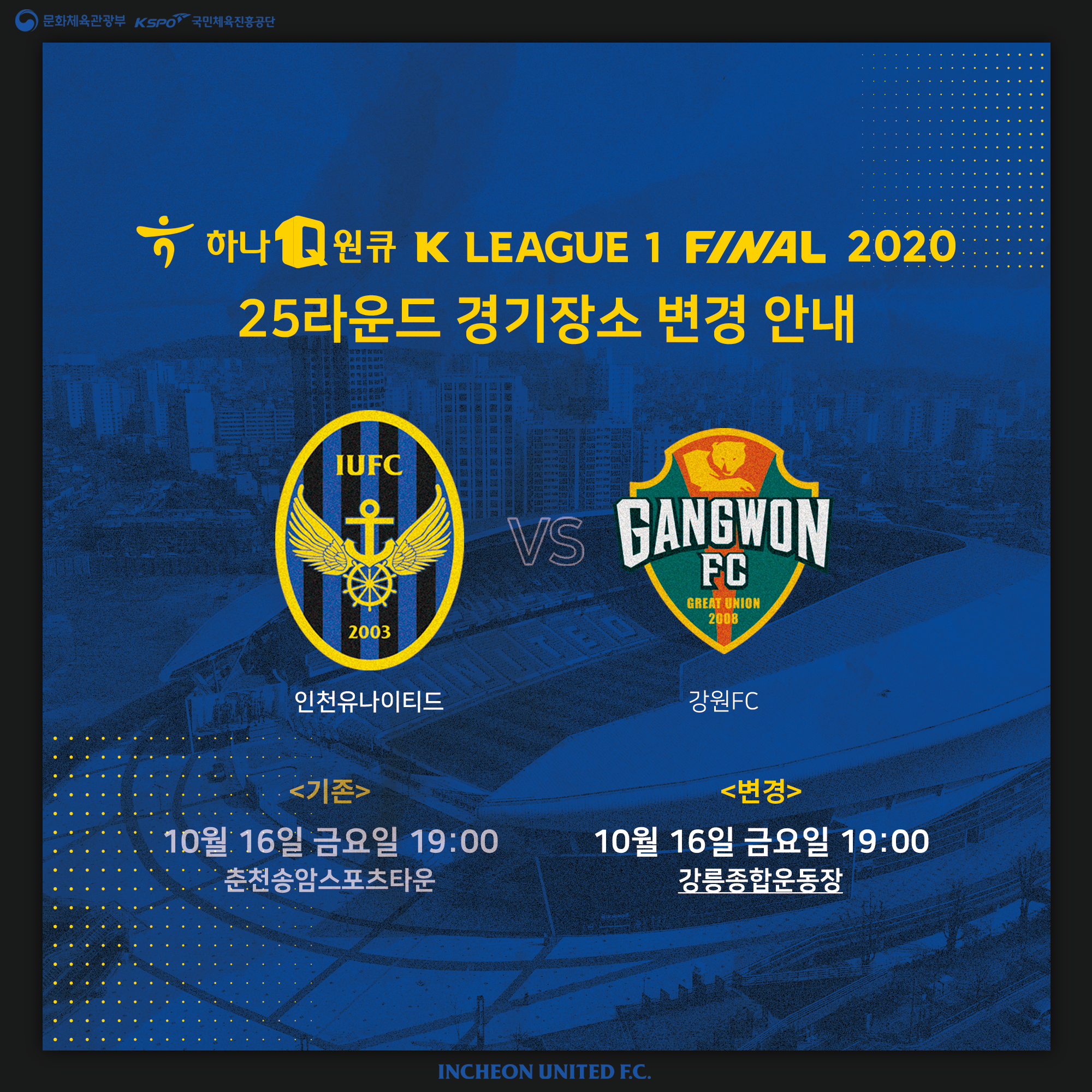 10월 16일 금요일 예정된 강원FC와의 K리그 1 25R 원정경기 장소가 변경되어 안내드립니다.