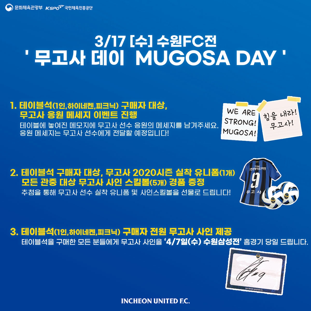 2. 테이블석 구매자 대상, 무고사 실착유니폼 경품 증정/ 모든 관중 대상, 무고사 사인스킬볼 경품 증정