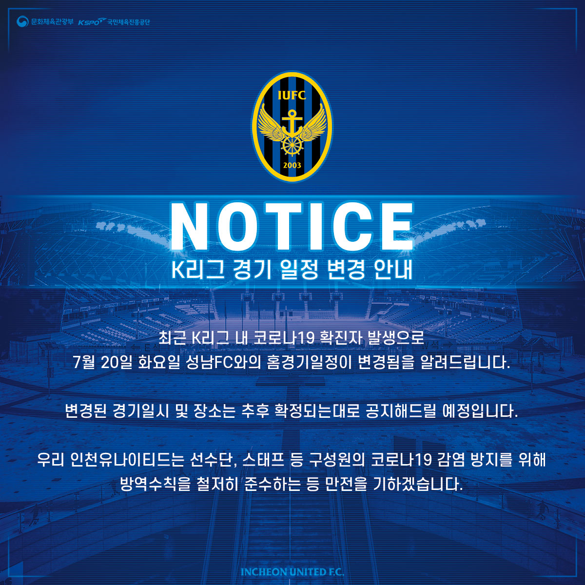 *우리 인천유나이티드는 선수단, 스태프 등 구성원의 코로나19 감염 방지를 위해 방역수칙을 철저히 준수하는 등 만전을 기하겠습니다.INCHEON UNITEDMEDIA FEEDS
