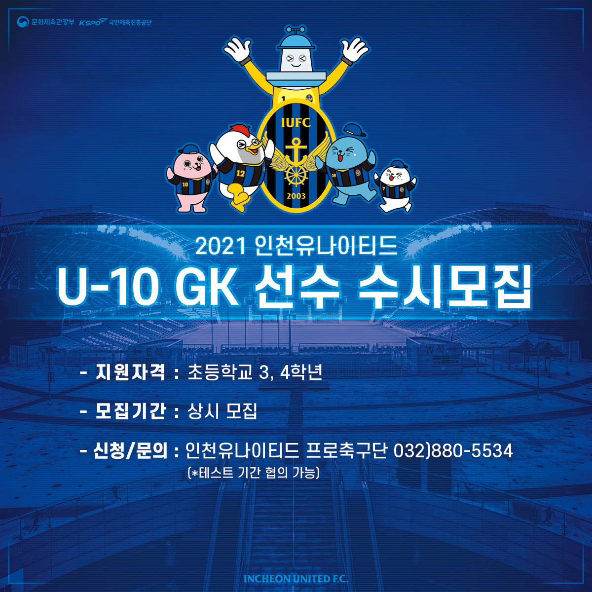 2021시즌 인천유나이티드 U-10 골키퍼(GK) 선수를 수시 모집하고 있습니다.