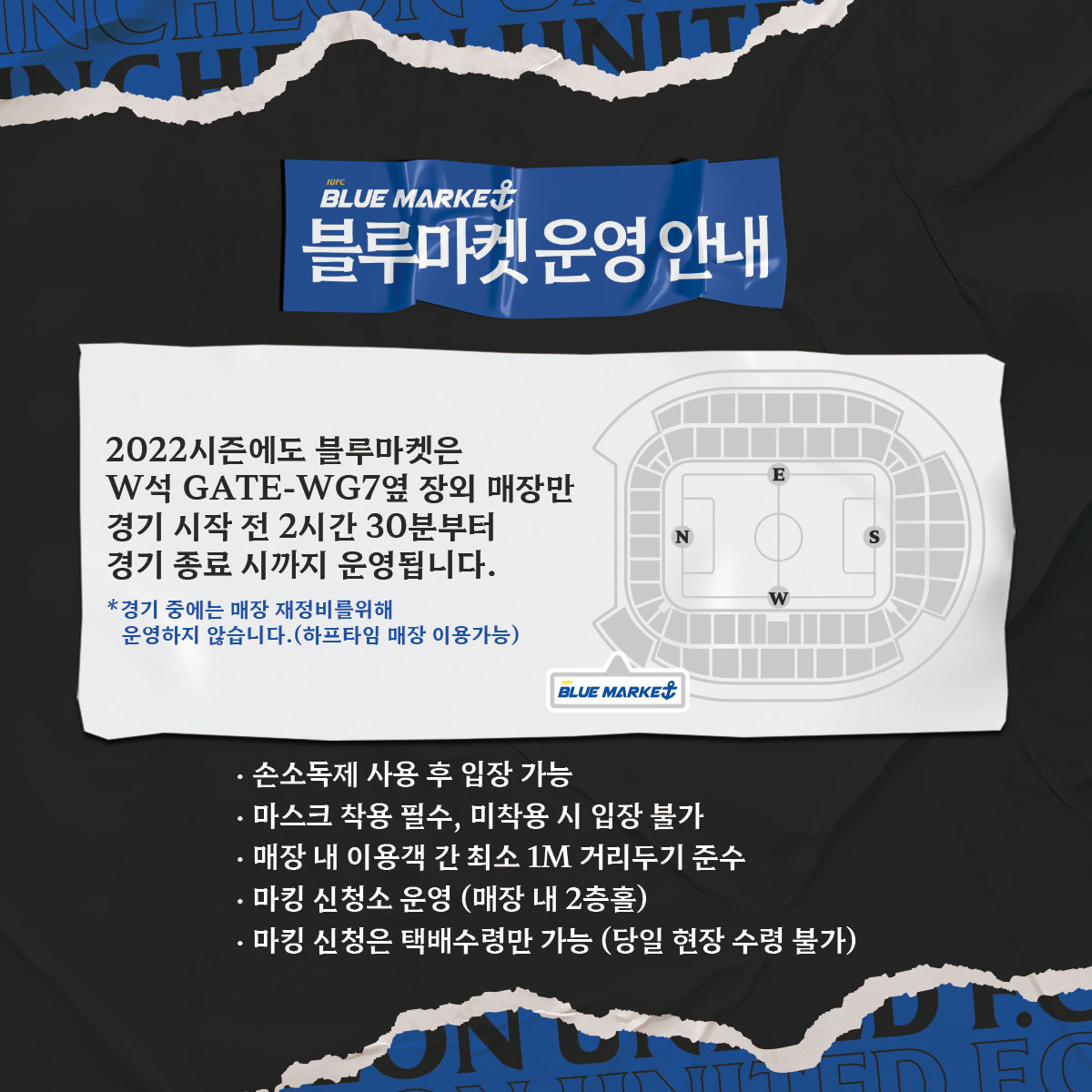 이번 홈경기 당일 오프라인 블루마켓 매장이 정상 운영됩니다. 2022시즌 블루마켓(W석 GATE-WG7옆)은 경기 시작 2시간 30분 전부터 운영됩니다. 아래 블루마켓 운영 시간을 참고하셔서 안전하고 즐거운 쇼핑 되시길 바랍니다.