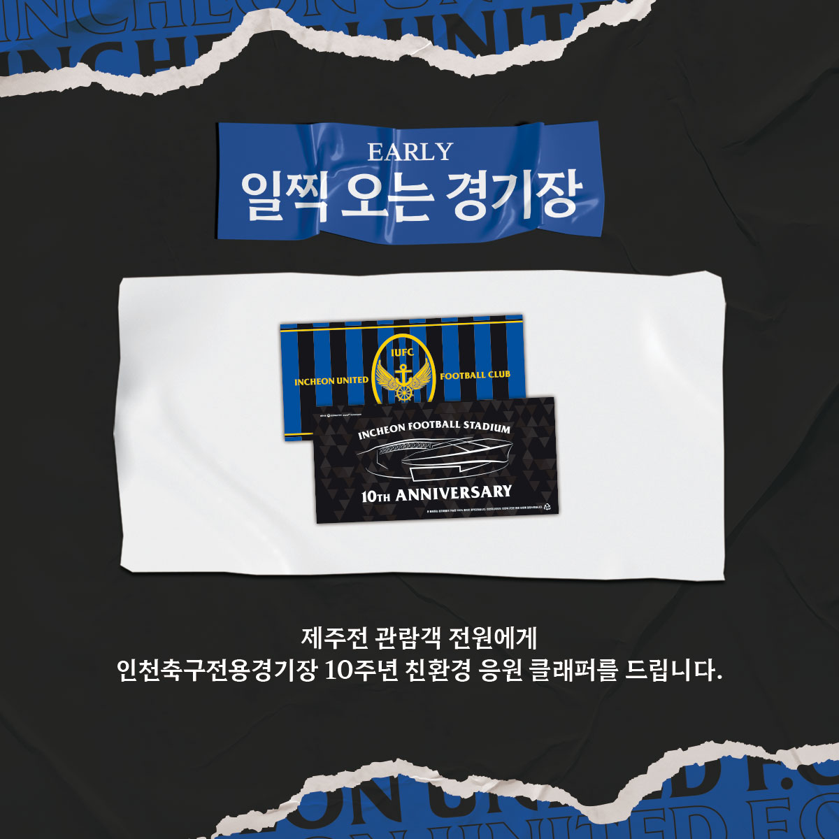 또한, 이번 제주전 홈경기에서는 입장객 전원에게 인천축구전용경기장 10주년 기념 응원용 클래퍼를 드립니다.