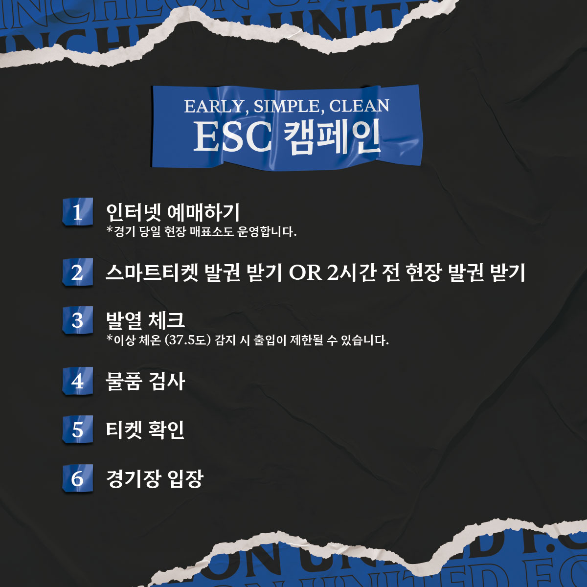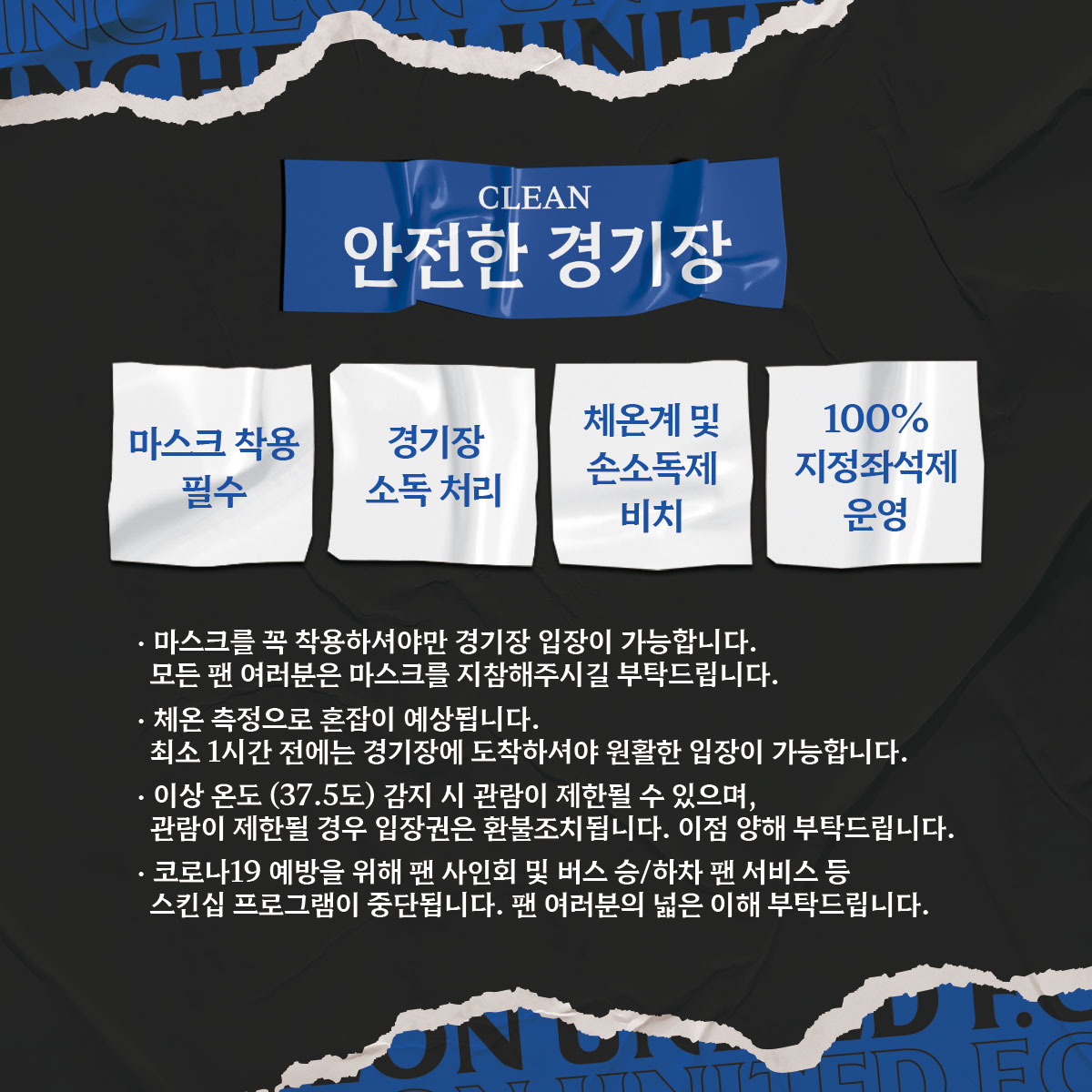 안전한 인천축구전용경기장을 만들기 위해 인천유나이티드와 관람객 여러분의 협조가 필요합니다. 아래 사항을 참고 및 숙지 부탁드립니다.
