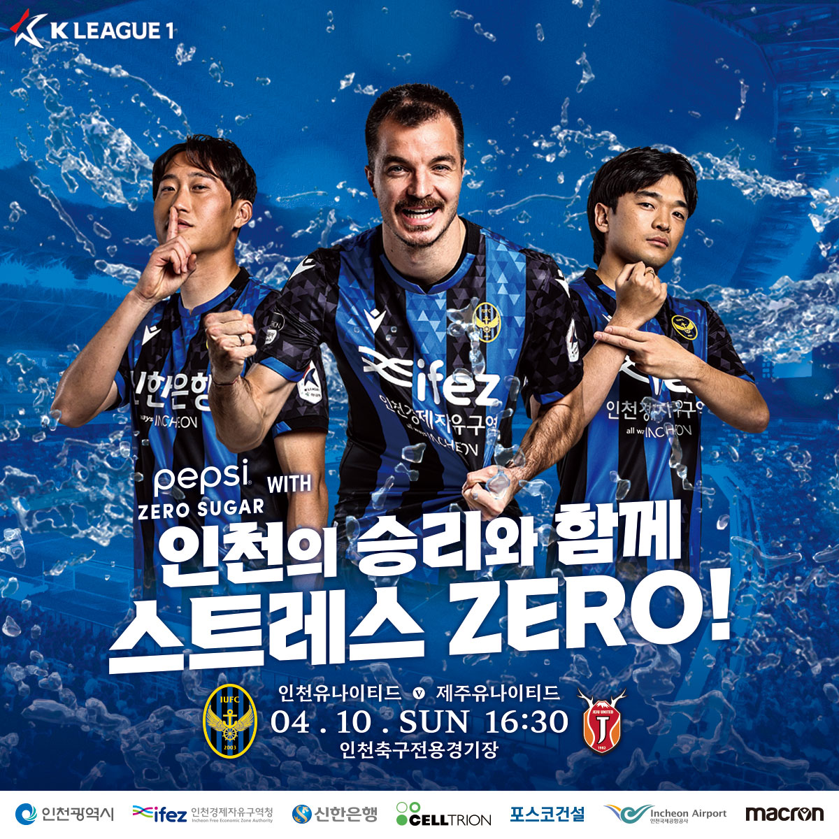 “인천의 승리와 함께! 스트레스 ZERO!(with Pepsi Zero Sugar)”4/10(일) 오후 4시 30분. 인천유나이티드가 제주유나이티드를 상대로 하나원큐 K리그 1 2022 9라운드 홈경기를 치릅니다.
