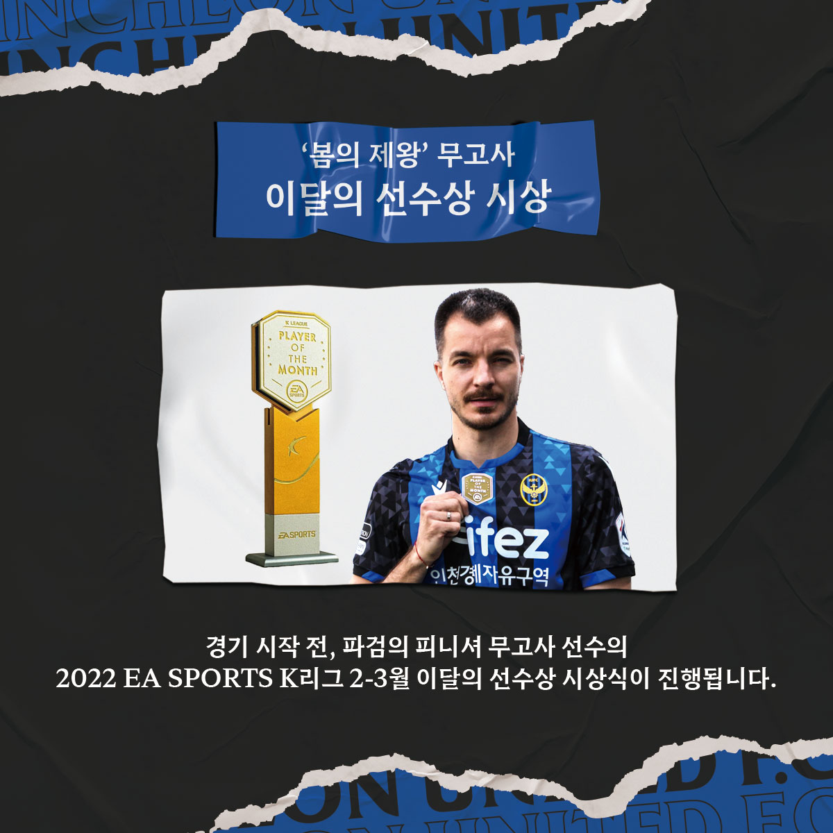 인천 팬 여러분, 경기장에 많이 찾아오셔서 무고사 선수의 이달의 선수상 수상을 축하해 주세요!