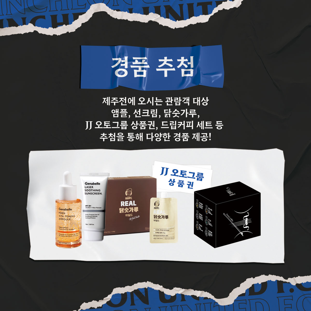 제주전에 오시는 관람객분을 대상으로 선크림, 앰플, 닭숫가루, JJ 오토그룹 모바일 상품권, 드립커피 세트 등 추첨을 통해 제공합니다. 인천유나이티드 홈경기에 오시는 팬 분들을 위해 다양하고 많은 경품을 준비했으니, 티켓을 버리지 말고 꼭 지참해 주세요!