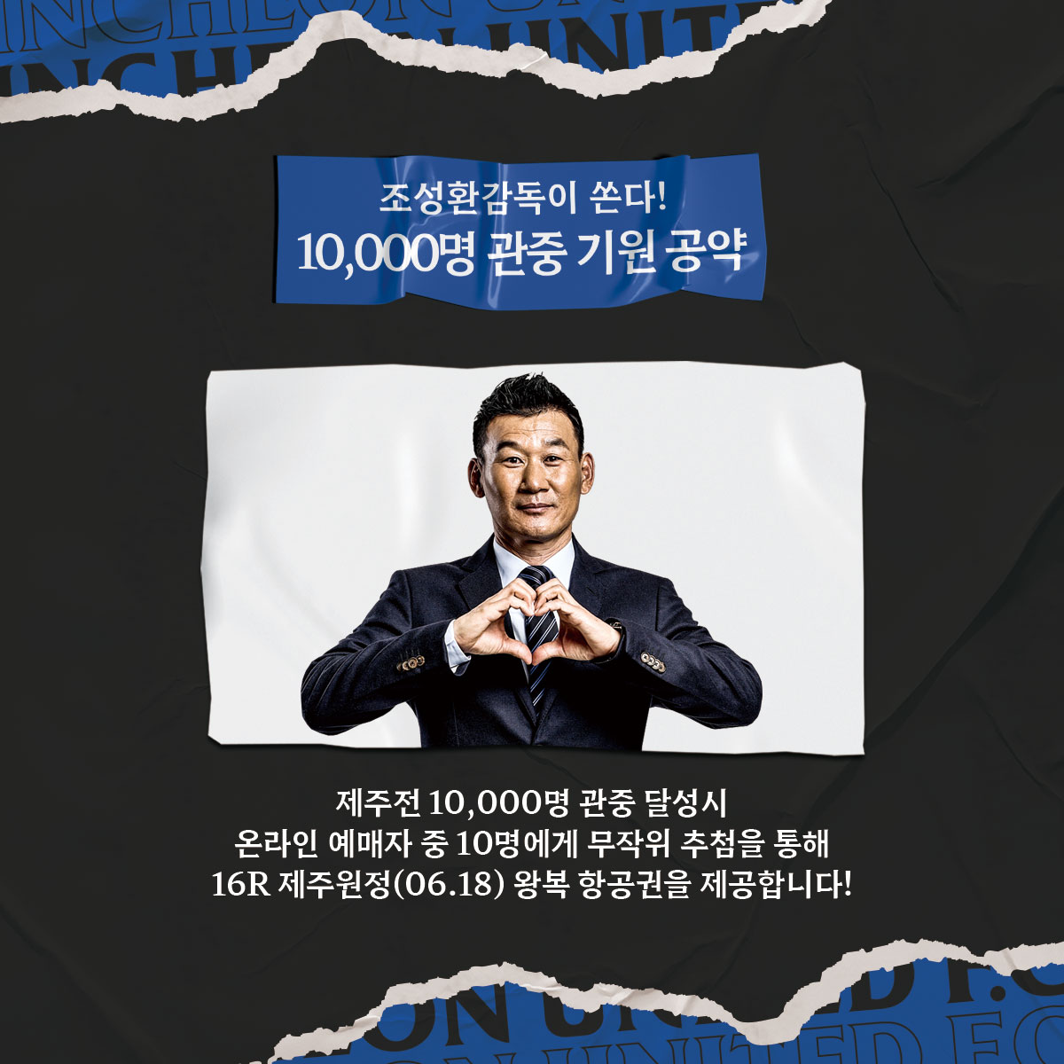 인천축구전용경기장에 1만 명 이상의 팬 여러분이 찾아오시면, 조성환 감독님이 다가오는 6/18(토) 제주 원정 항공권을 지원한다고 약속했습니다.