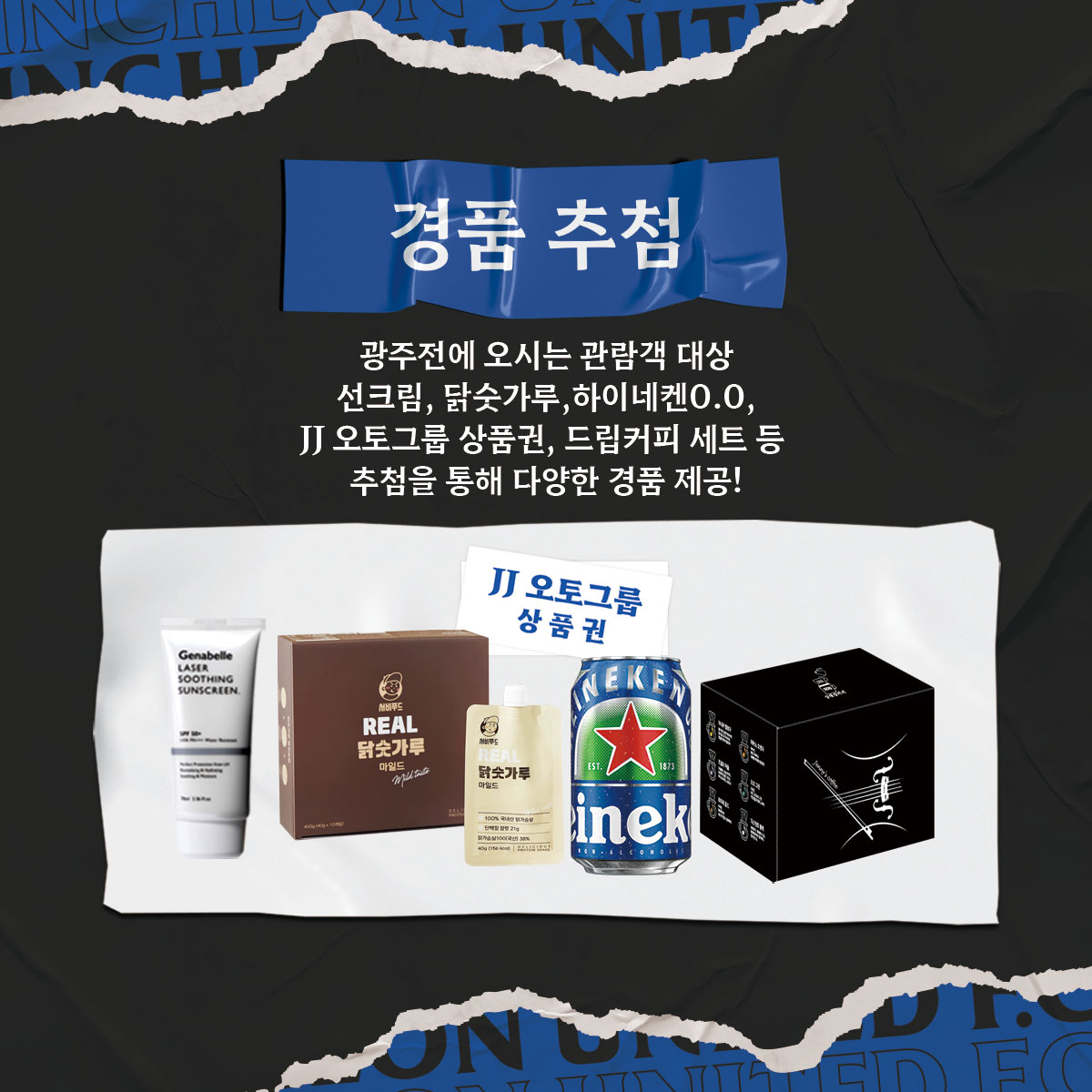 광주전에 오시는 관람객을 대상으로 선크림, 닭숫가루, JJ 오토그룹 모바일 상품권, 드립커피 세트, 하이네켄 제로제로 등 추첨을 통해 제공합니다!