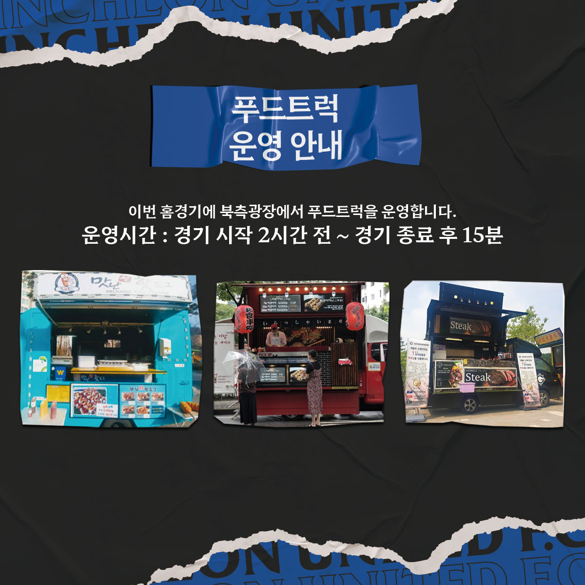 ※ 경기 시간(19:00~20:45)에는 매장 재정비를 위해 운영되지 않습니다. 단, 하프타임 시간에는 운영됩니다.▶ 티켓구매 : https://iufc.kr/ti▶ 고객센터 : 032-880-5500
