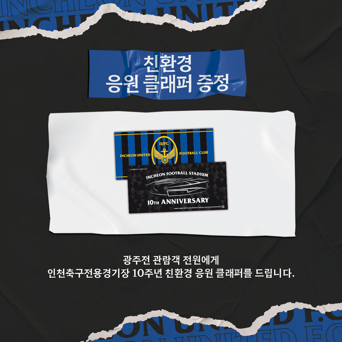 이번 광주전 홈경기에서는 관람객 전원에게 인천축구전용경기장 10주년 기념 친환경 응원용 클래퍼를 드립니다.