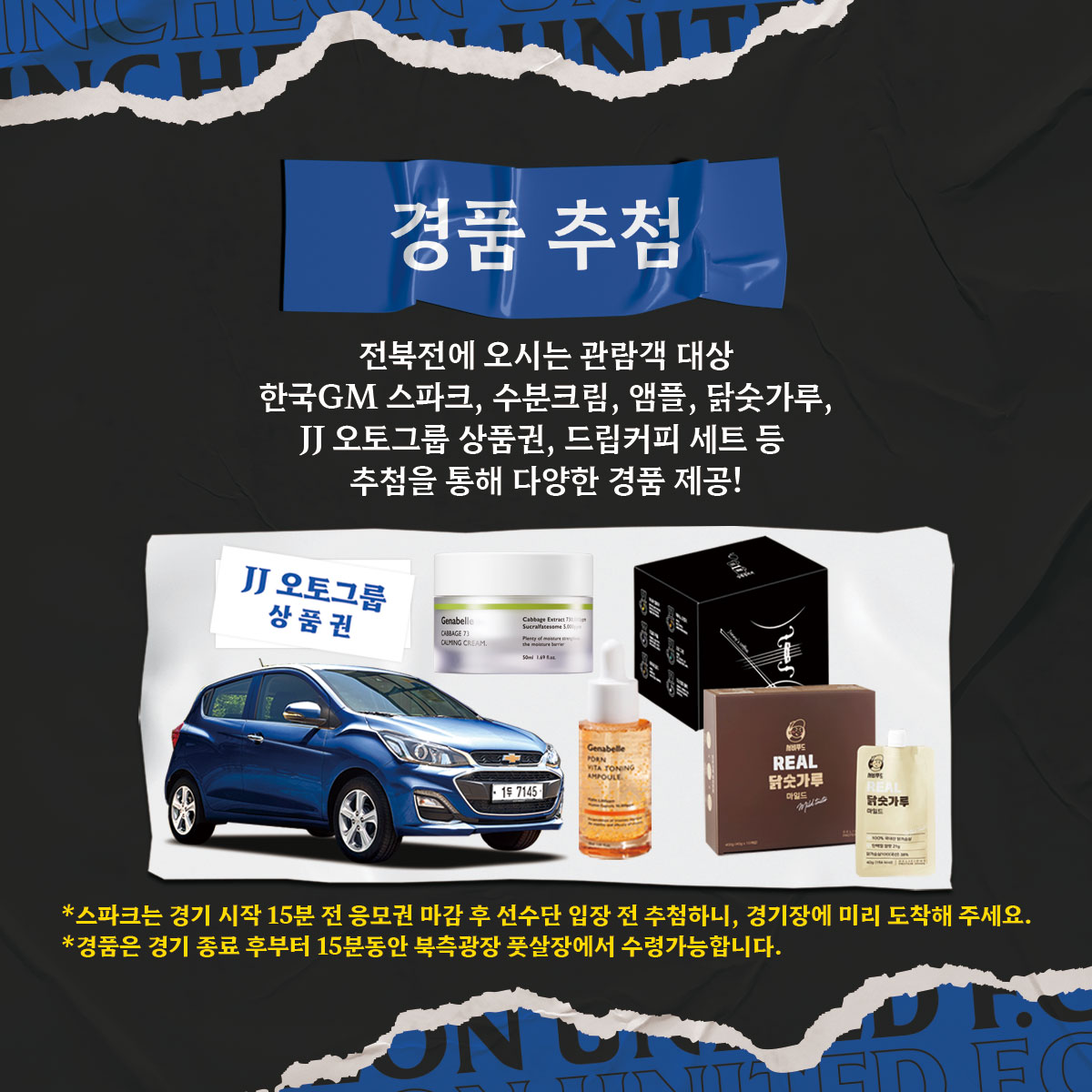 전북전에 오시는 관람객분을 대상으로 한국GM 쉐보레 스파크, 앰플, 닭숫가루, JJ 오토그룹 모바일 상품권, 드립커피 세트 등 추첨을 통해 제공합니다.