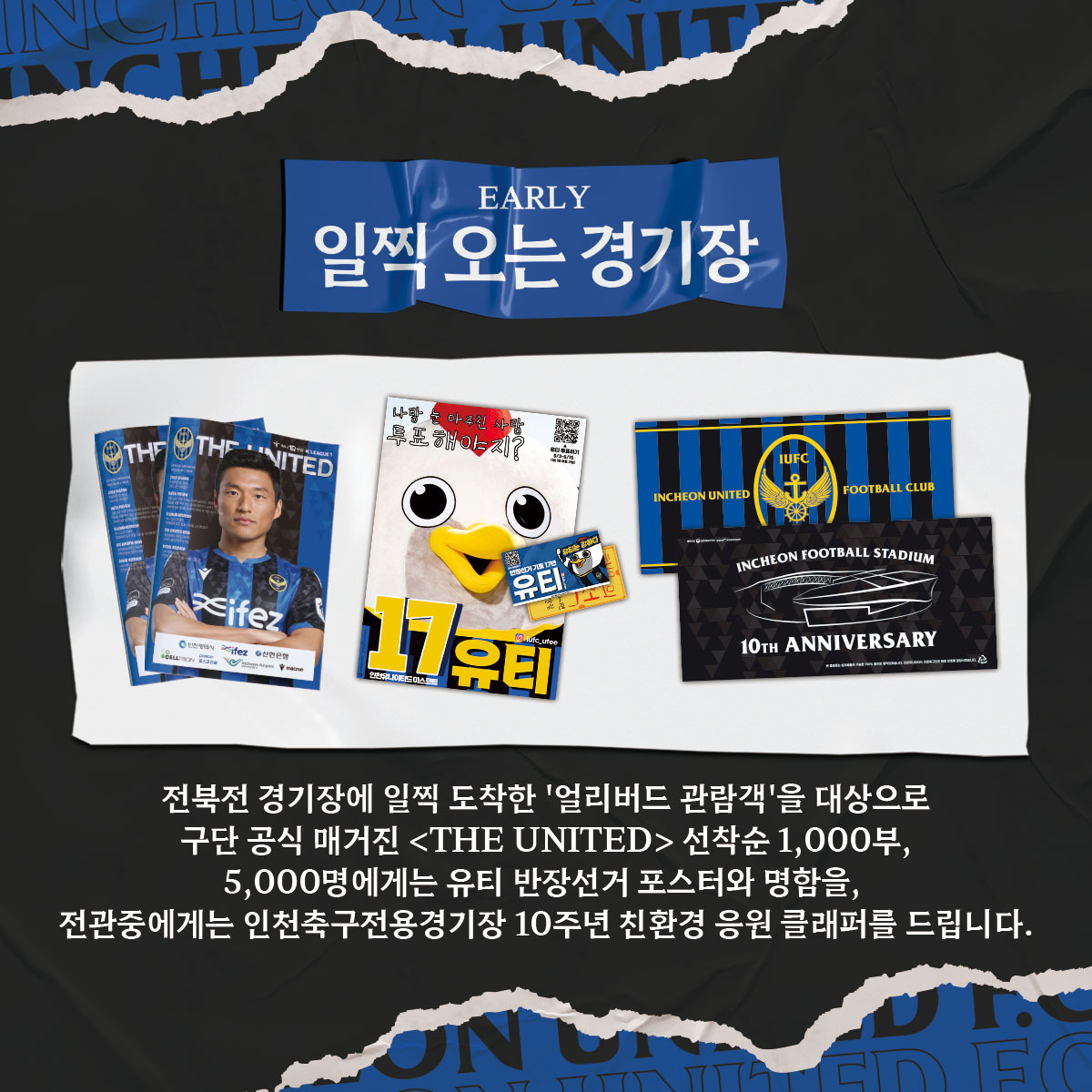 이번 전북전 홈경기에 일찍 오시는 관람객 분들께 구단 공식 매거진 1,000부, 마스코트 유티 반장선거 포스터와 명함 5,000개를 선착순으로 제공합니다.
