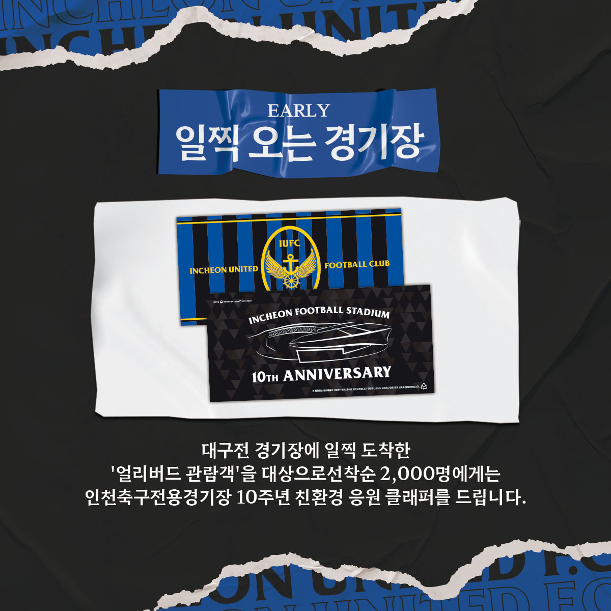 또한, 이번 대구전 홈경기에서는 입장객 중 선착순 2,000명에게 인천축구전용경기장 10주년 기념 응원용 클래퍼를 드립니다.