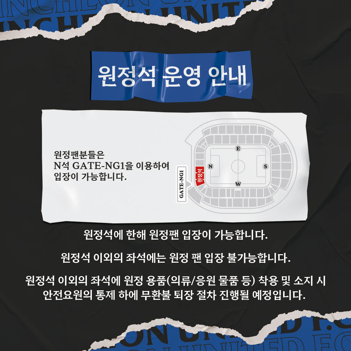 안전한 인천축구전용경기장을 만들기 위해 인천유나이티드와 관람객 여러분의 협조가 필요합니다. 아래 사항을 참고 및 숙지 부탁드립니다.