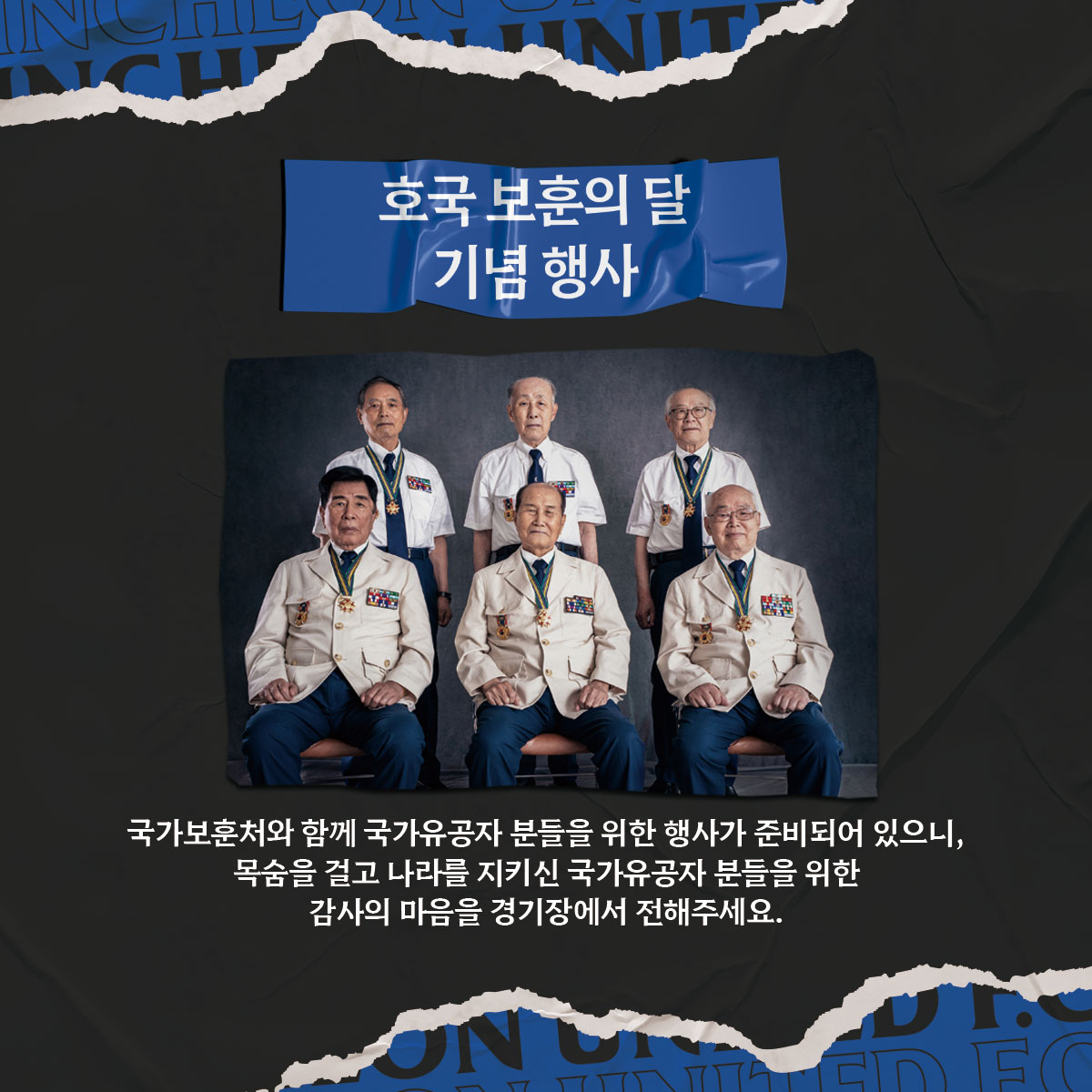 인천 팬 여러분! 경기장에 찾아오셔서 목숨을 걸고 나라를 지키신 국가유공자 분들에 대한 감사의 마음을 전해주세요.