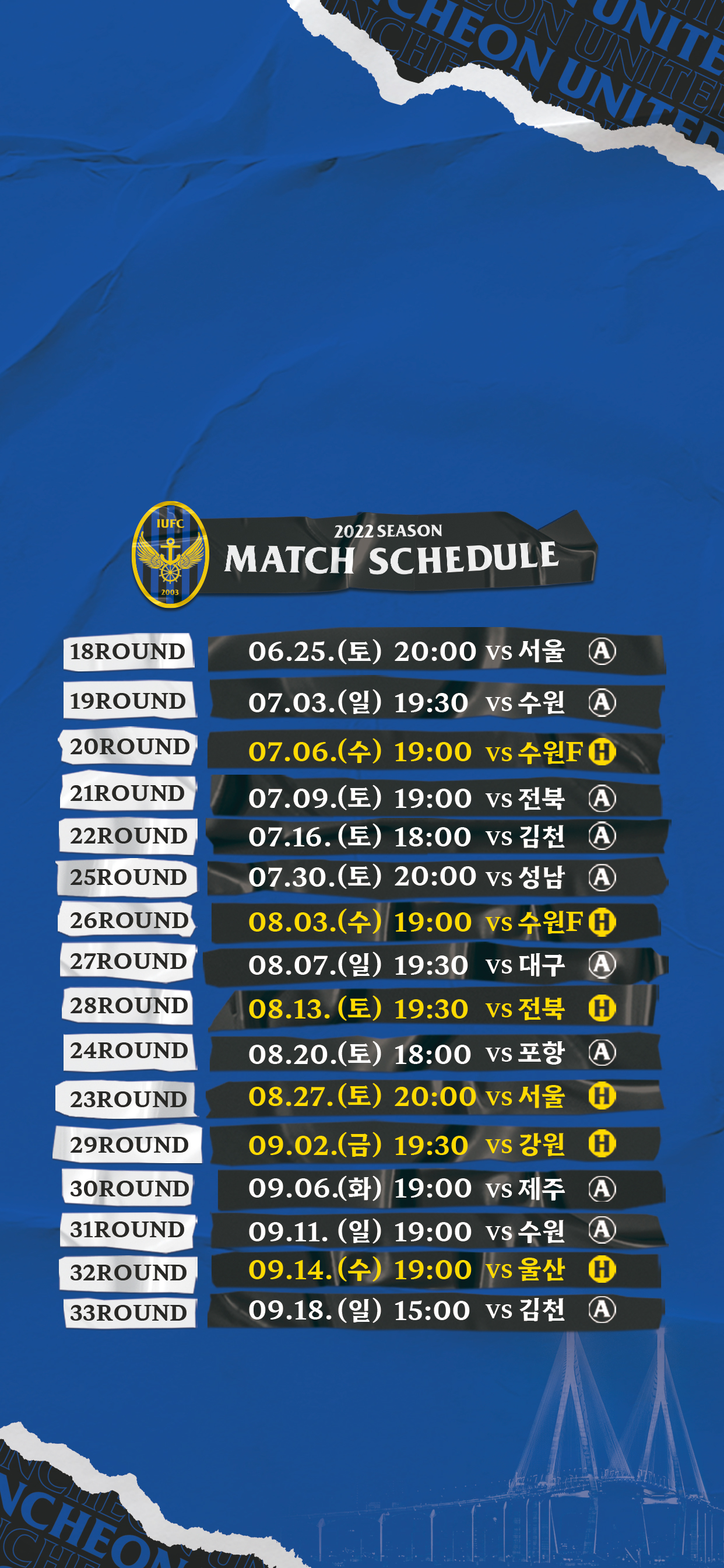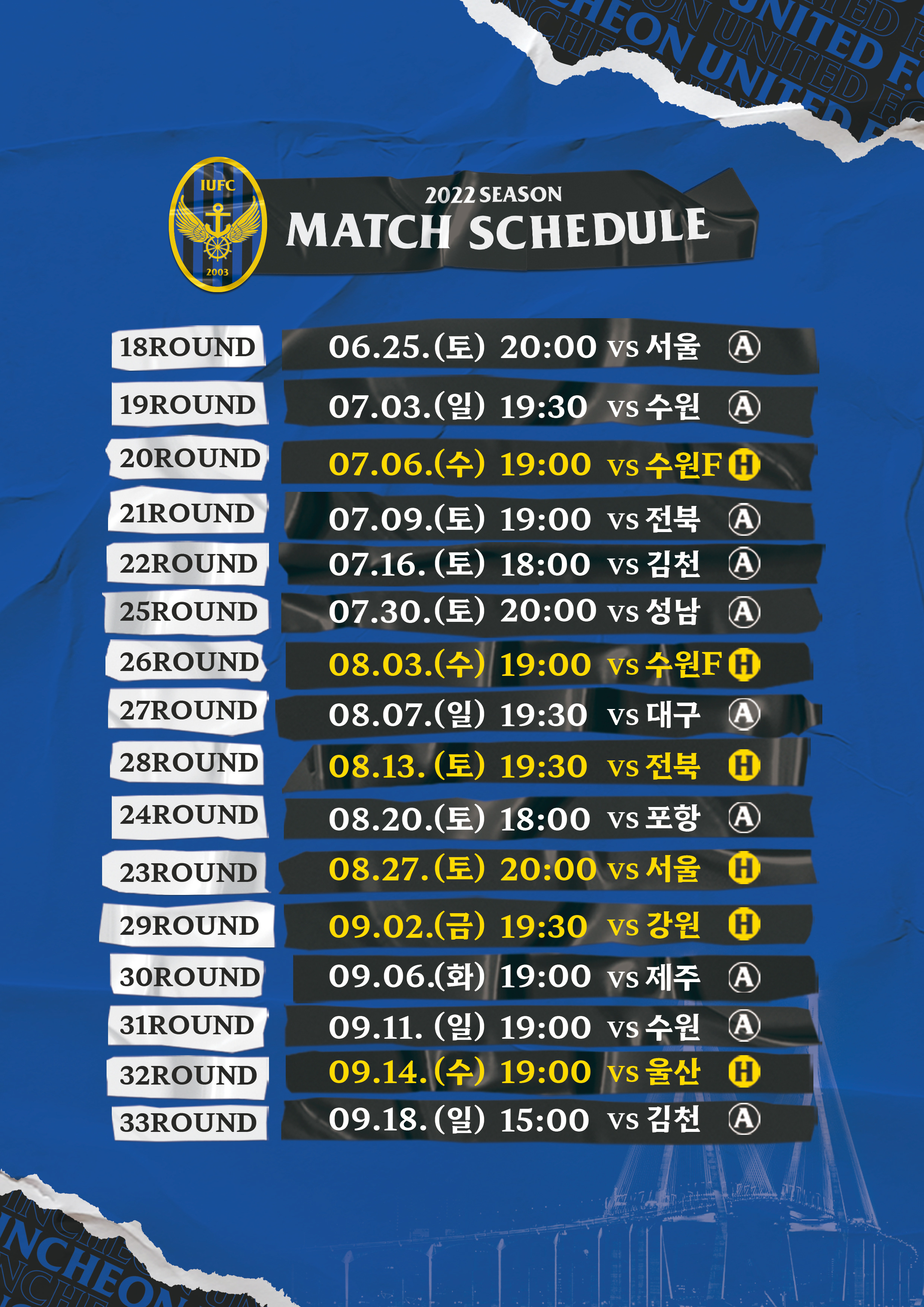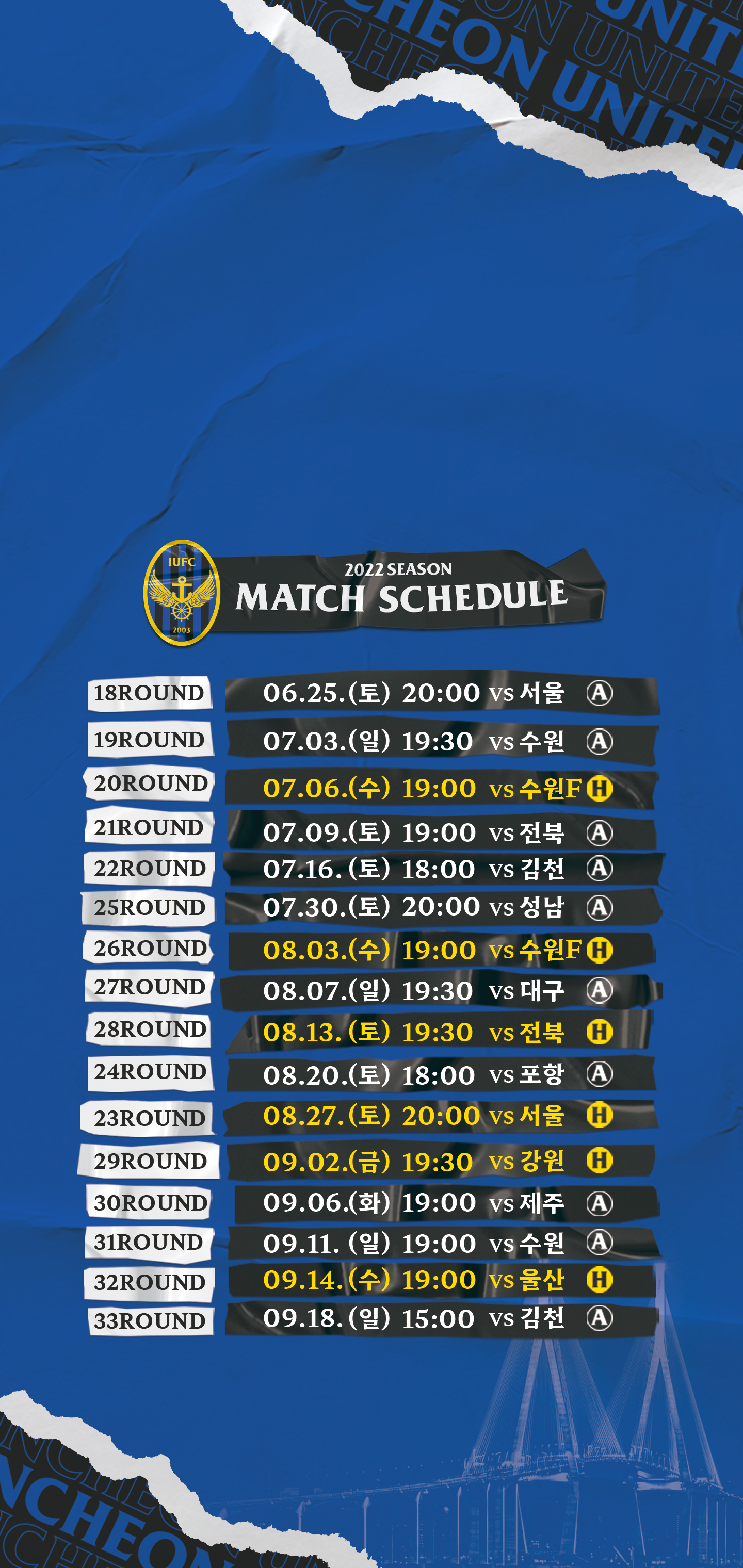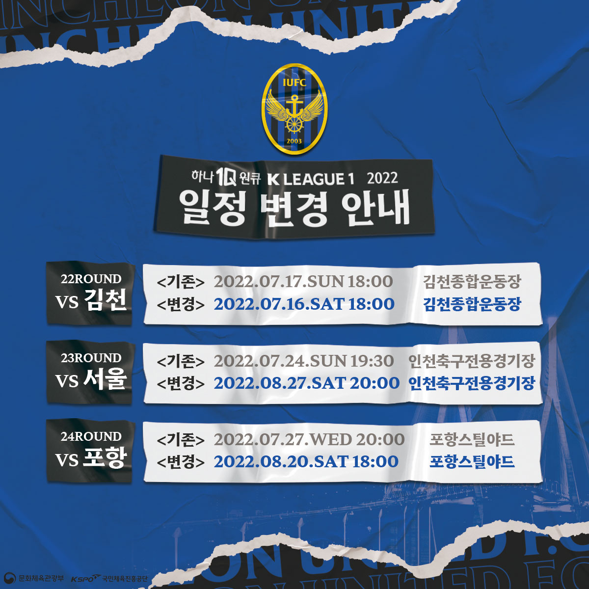 안녕하세요, 인천유나이티드입니다. 2022 K리그 1 22R 김천전~24R 포항전 일정이 변경되어 다음과 같이 안내드립니다. 변경된 일정을 참고해주시기 바랍니다.