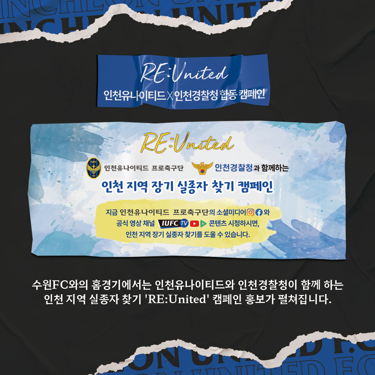 인천 지역 실종자 찾기 RE:United(리:유나이티드) 캠페인은 인천 구단과 인천경찰청이 2022시즌부터 함께하는 사회공헌활동으로, 인천 구단 소셜미디어를 활용해 인천 지역 내 실종 아동 등 사회적 약자의 조속한 복귀와 발견을 위해 대외적으로 홍보하고, 사회적 안전망 공동체를 구축하는 지역 상생 프로젝트입니다. 캠페인 명 RE:United는 다시(Re) 가족의 품으로 돌아와 함께하길(United) 바란다는 것을 뜻합니다.