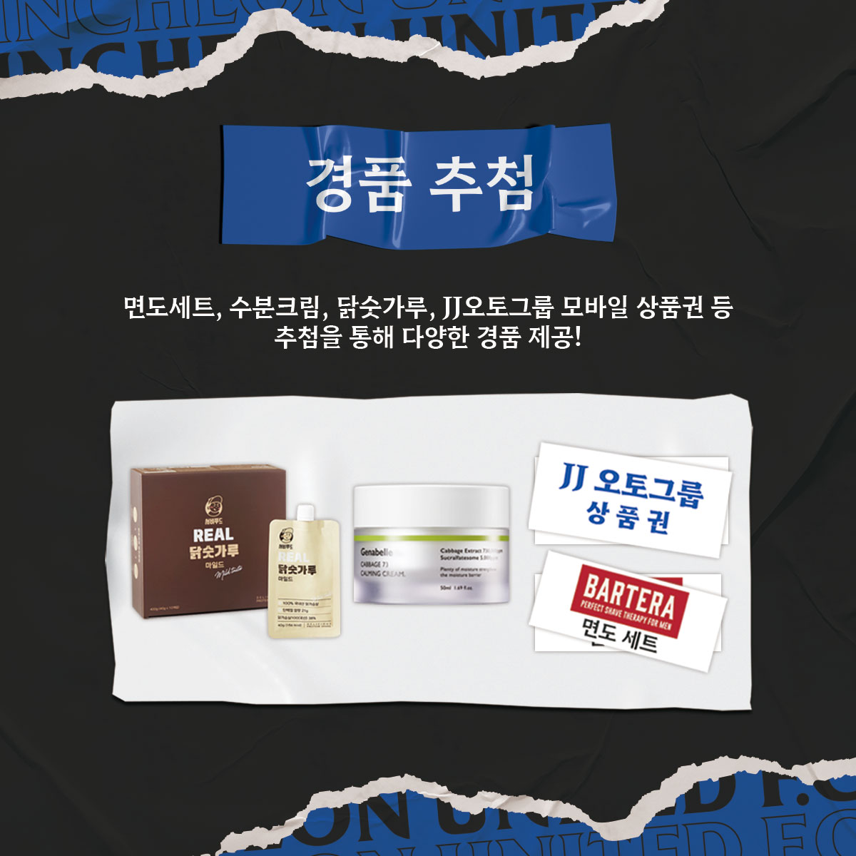 수원FC전에 오시는 관람객분을 대상으로 수분크림, 앰플, 닭숫가루, JJ 오토그룹 모바일 상품권, 드립커피 세트 등 추첨을 통해 제공합니다. 티켓을 버리지 말고 꼭 지참해 주세요!