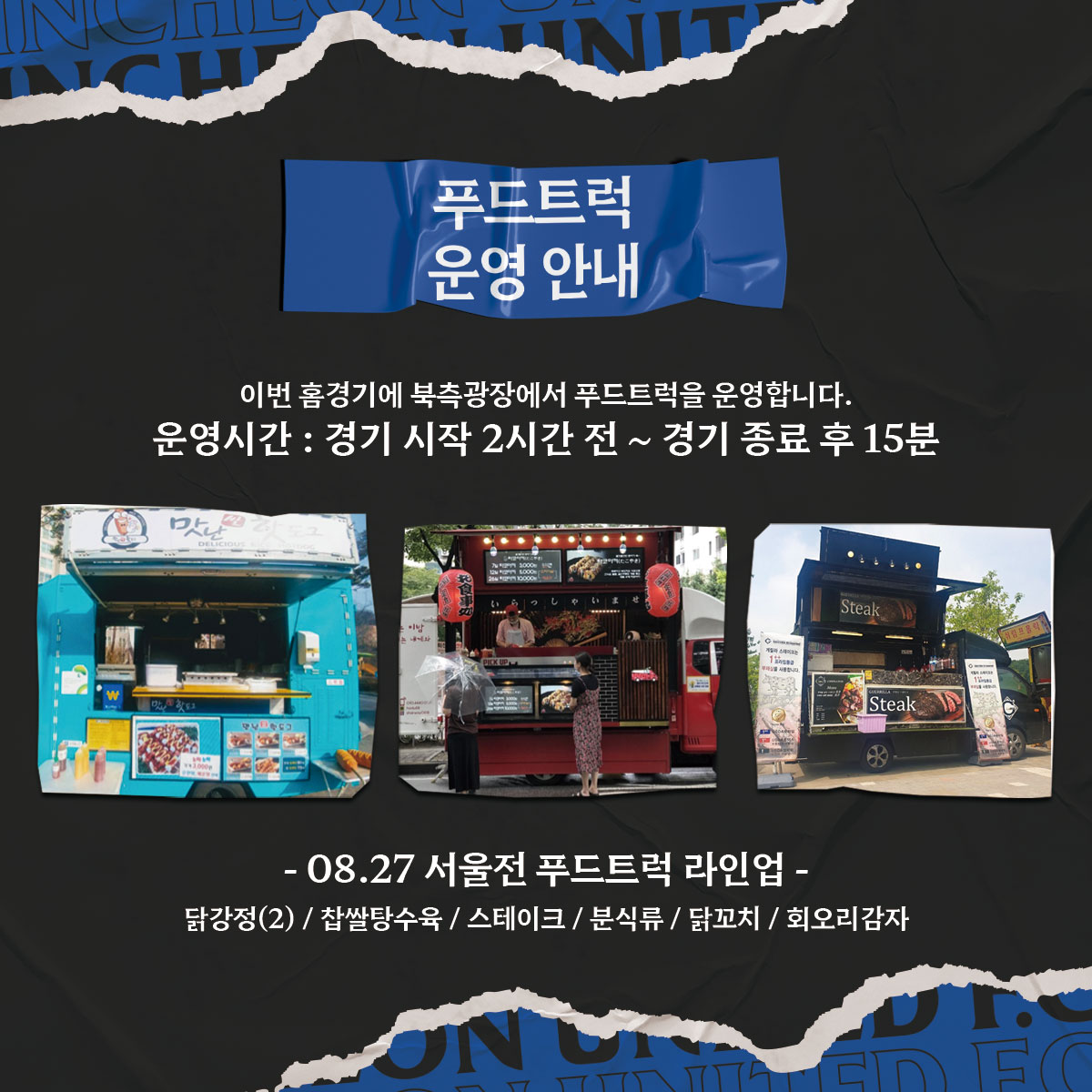 ※ 경기 시간(20:00~21:30)에는 매장 재정비를 위해 운영되지 않습니다. 단, 하프타임 시간에는 운영됩니다.▶ 티켓구매 : https://iufc.kr/ti▶ 고객센터 : 032-880-5500