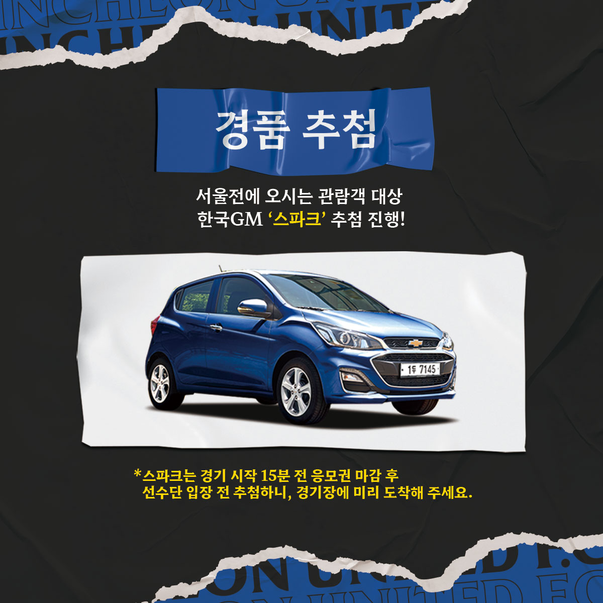 이번 서울과의 라이벌전에 오시는 모든 관람객분을 대상으로 한국GM 스파크 경품 추첨이 있습니다.경기 시작 15분전 응모권 마감 후 선수단 입장 전 추첨을 하니 꼭 경기장에 서둘러 입장해 주세요!