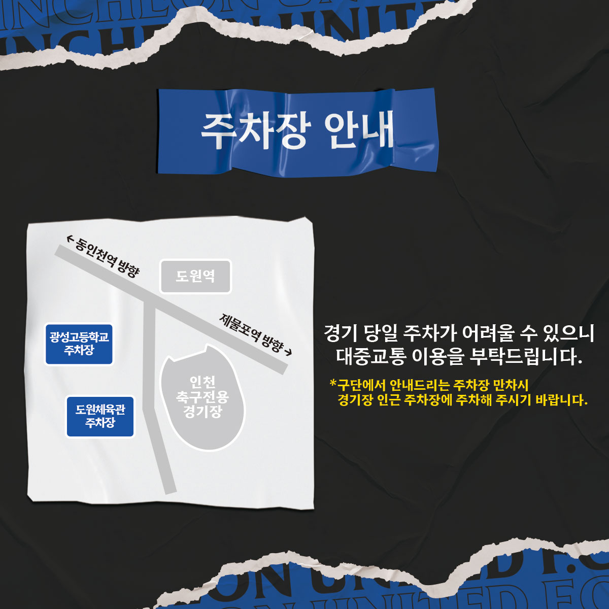 경기 당일 많은 관중으로 인해 주차장 만차가 예상되니 대중교통 이용을 부탁드립니다.