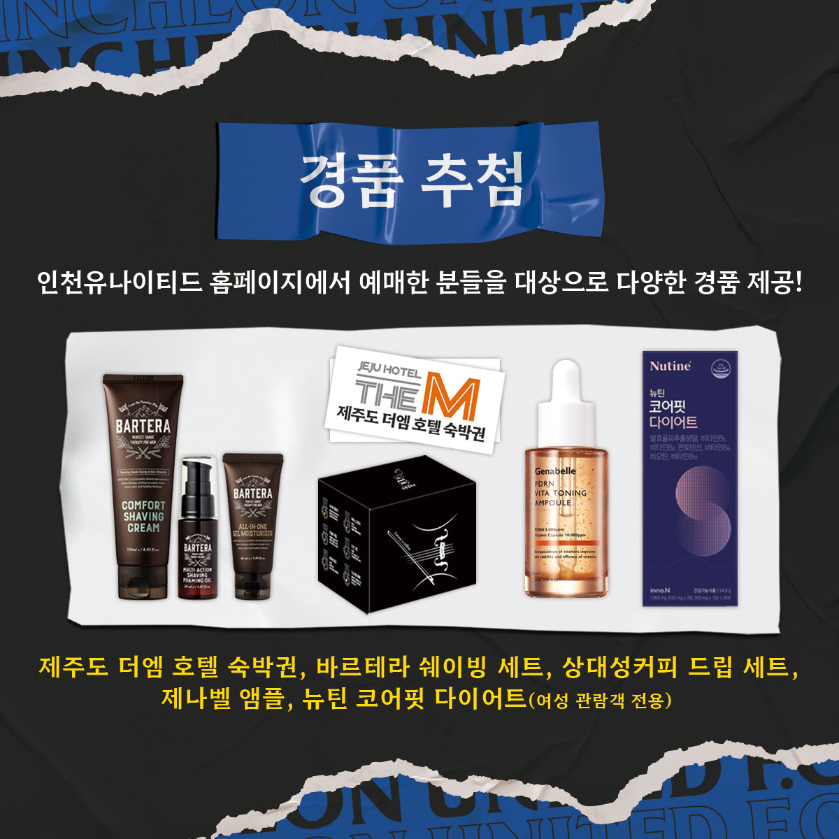 울산전에 오시는 관람객분 대상 하프타임 경품 추첨을 통해 쉐이빙 세트, 드립커피 세트, 앰플, 뉴틴 코어핏 다이어트 등을 제공합니다.