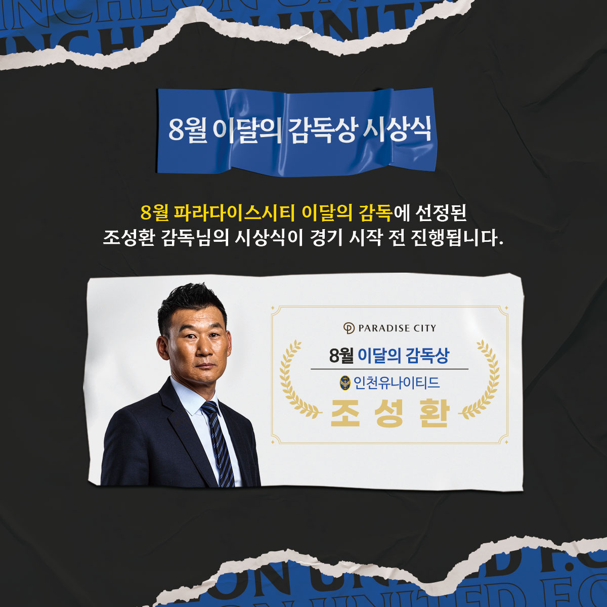 조성환 감독, 8월 이달의 감독 시상식8월 5경기에서 3승 2무의 호성적을 거둔 '조버지' 조성환 감독님의 8월 이달의 감독상 시상식이 경기 시작 전 식전 행사로 진행됩니다.