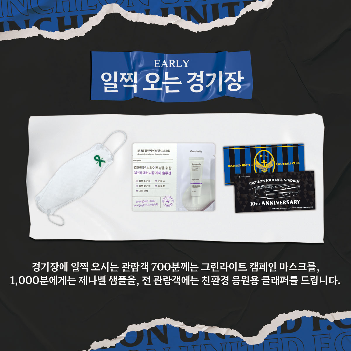 이번 울산전 홈 경기에서는 일찍 오시는 '얼리버드 관람객' 대상 선착순 700분께 그린라이트 마스크를, 선착순 1,000분에게는 제나벨 기미크림 샘플을 드립니다!