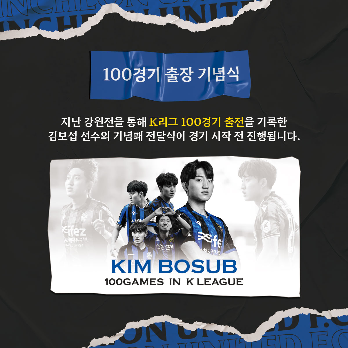 앞으로도 인천을 위해 더 많은 경기에 출전을 할 수 있도록 경기 시작 전 식전 행사로 진행되는 100경기 출장 기념식에서 축하와 응원의 박수를 부탁드립니다!