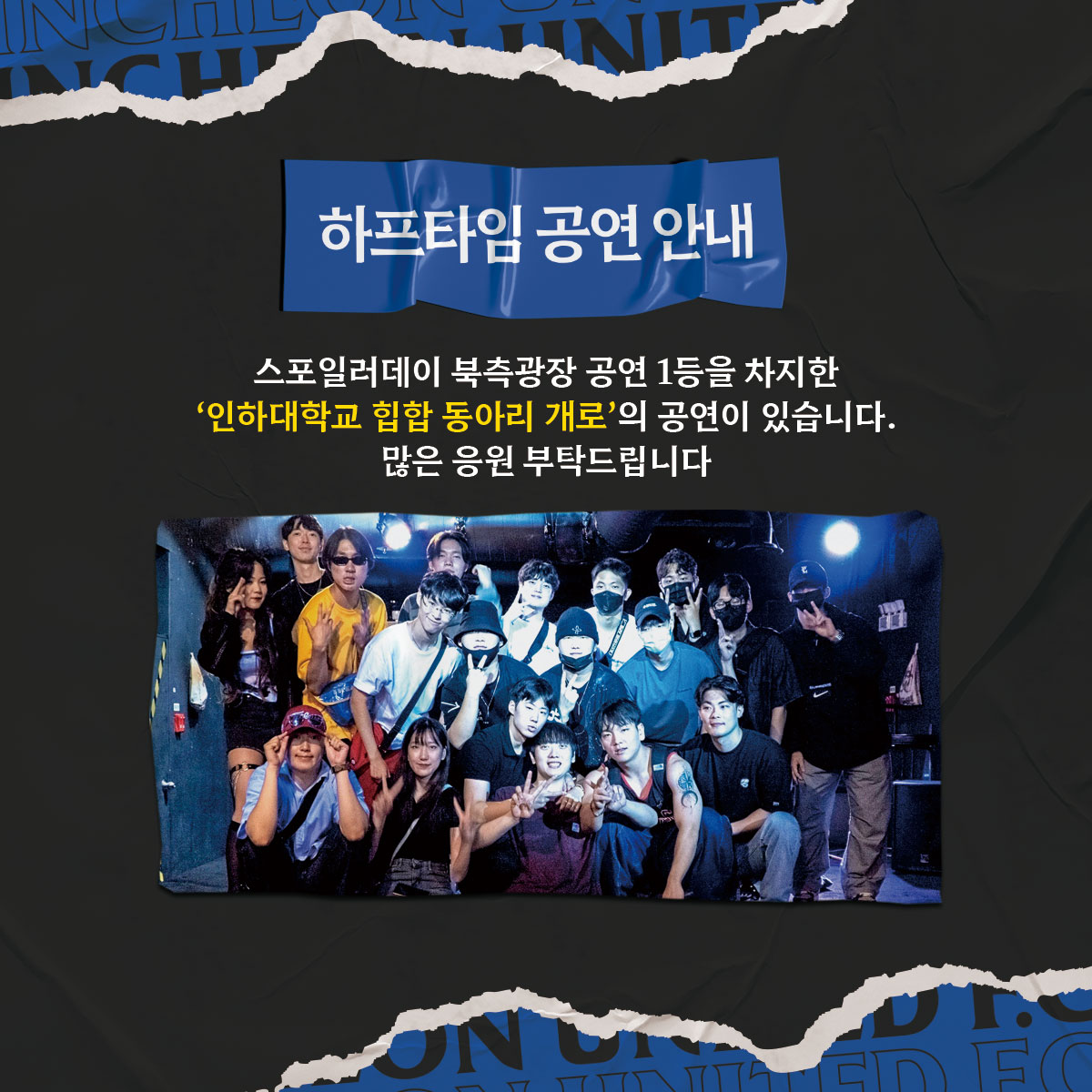 ※ 본 이벤트는 구단에서 진행하거나 선정하지 않습니다. 관련 문의는 희망의 씨앗 측으로 부탁드립니다.스포일러데이 공연 1등 팀 하프타임 공연8/27(토) 인경전 스포일러데이에 북측광장에서 펼쳐진 공연에서 우승한 인하대학교 힙합동아리 개로!