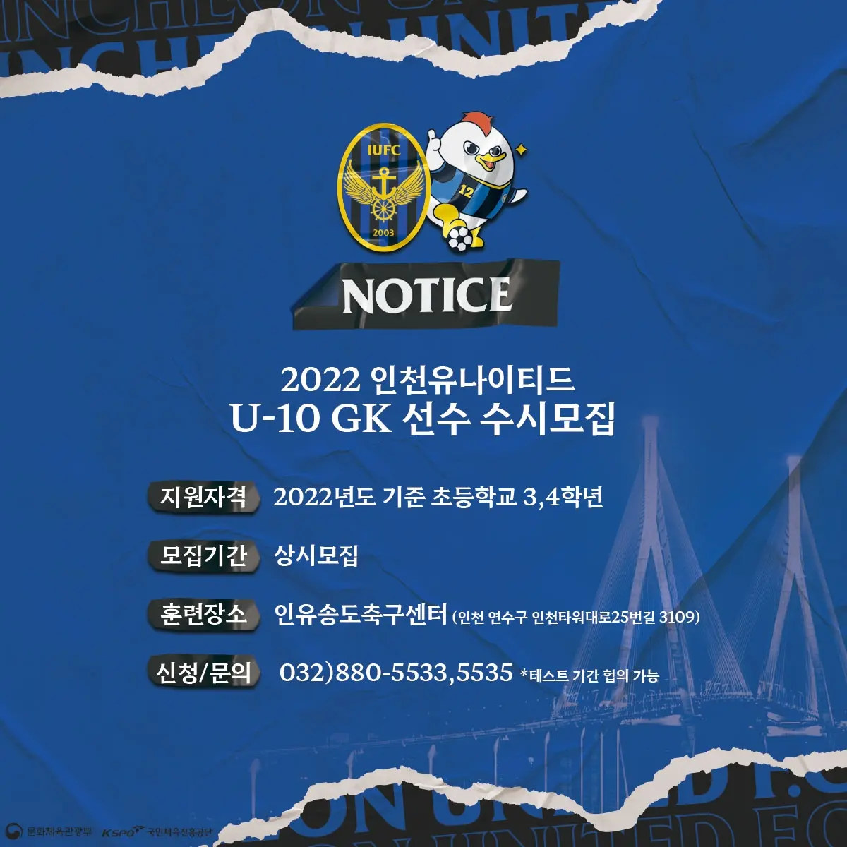 2022시즌 인천유나이티드 U-12/U-10/U-8 필드 및 U-10 골키퍼 선수 상시 모집 중입니다.