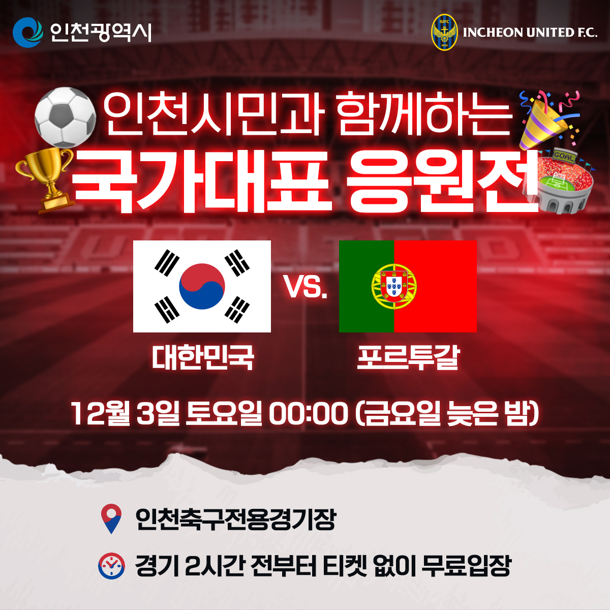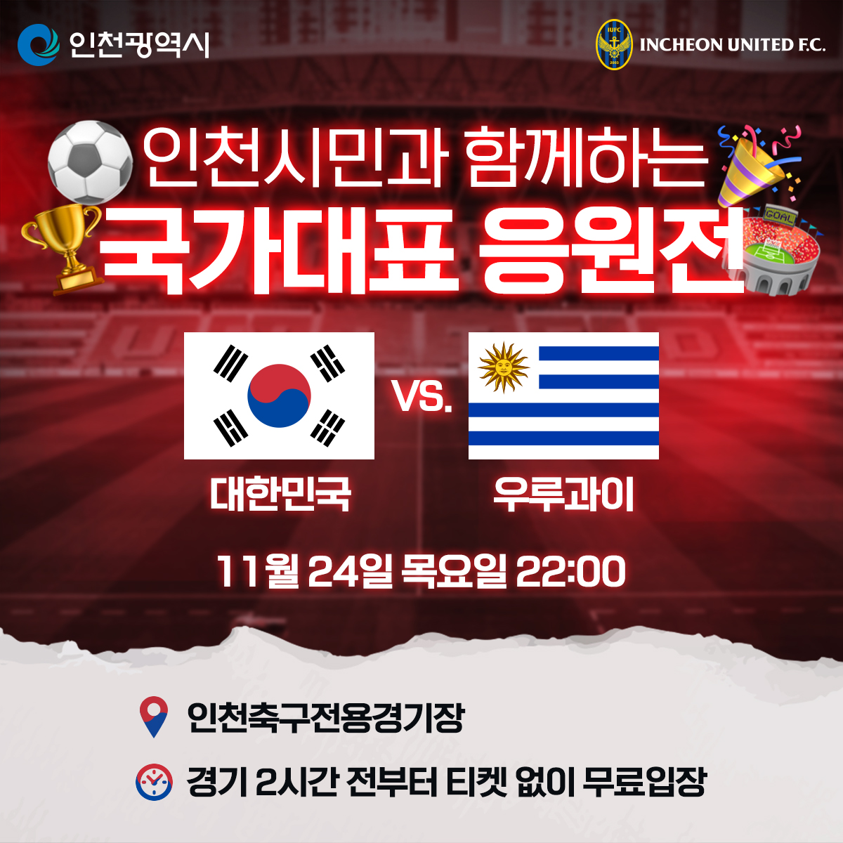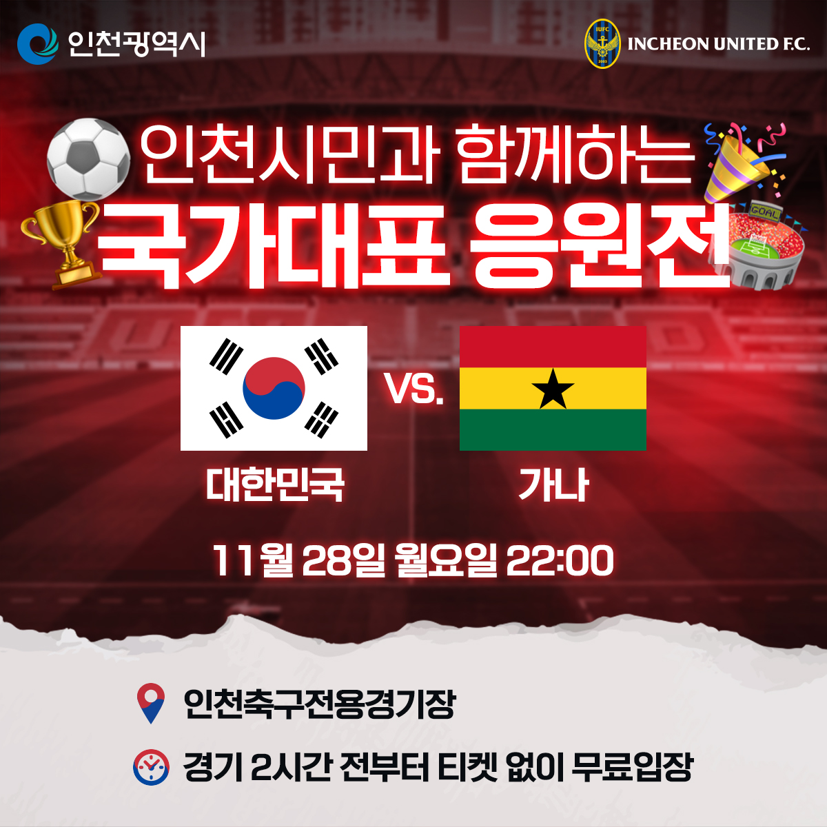 경기 1시간 전 : 붉은악마 주도 응원배우기 및 축하공연, 태극기 퍼포먼스 등 예정