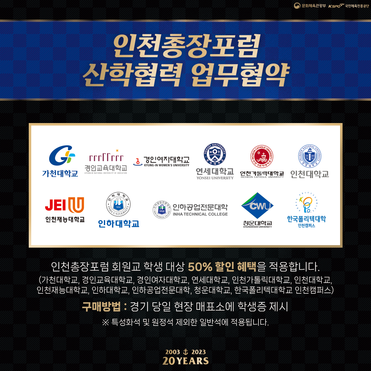 인천총장포럼 회원인 인천 지역 11개 대학교 학생들은 FA컵 16강전 경기를 50% 할인된 가격으로 관람하실 수 있습니다!
