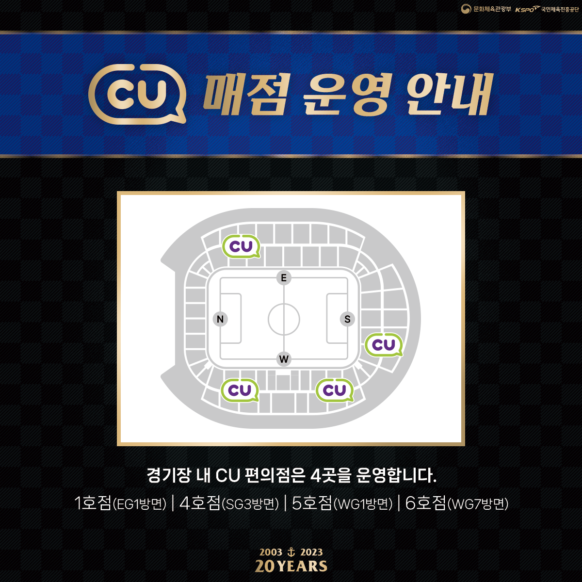 홈경기 당일 경기장 내 CU 편의점 4곳을 운영합니다. 자세한 사항은 이미지를 참고해주세요.