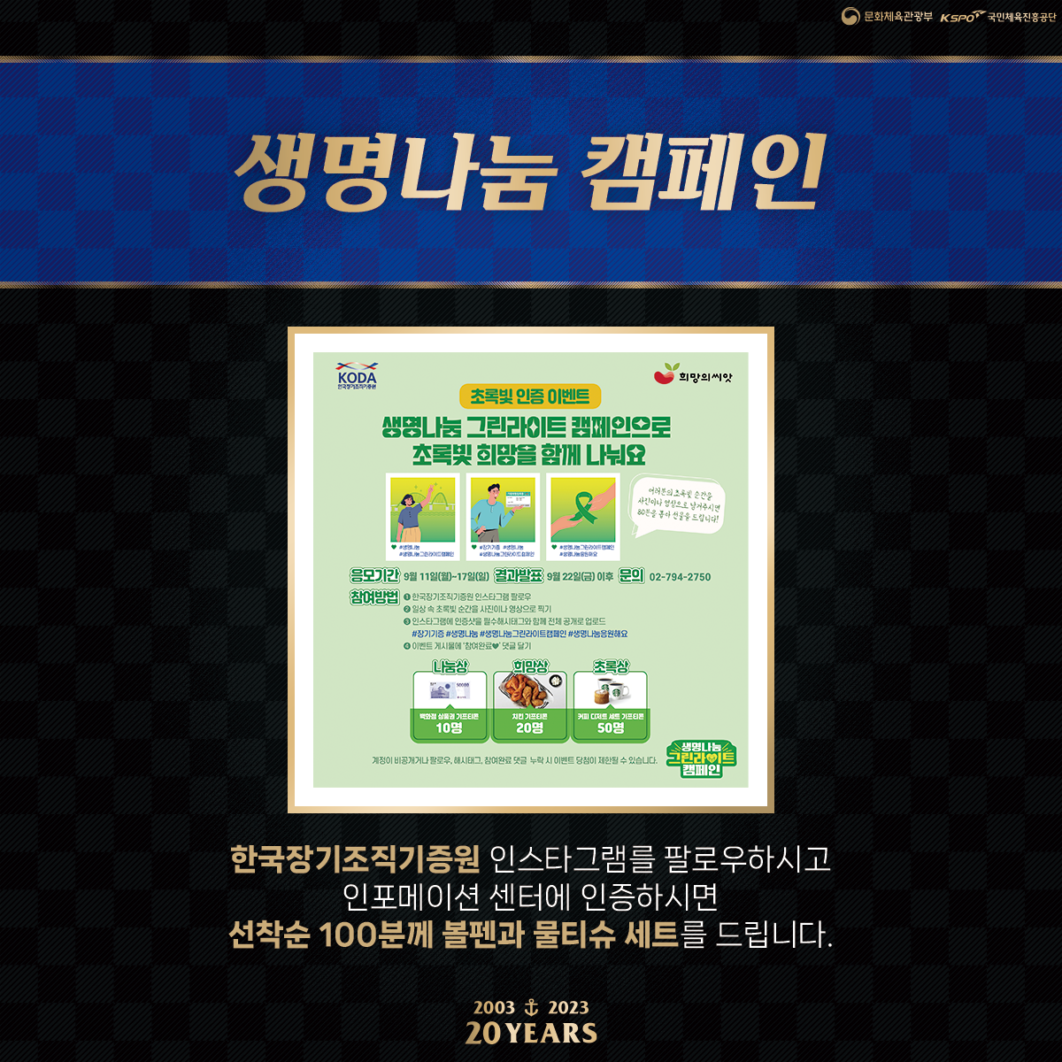 매년 9월 둘째주는 생명나눔주간입니다. 북측광장 인포메이션 센터에서 한국장기조직기증원 인스타그램을 팔로우를 인증해주시는 선착순 100분께는 볼펜과 물티슈를 증정합니다.
