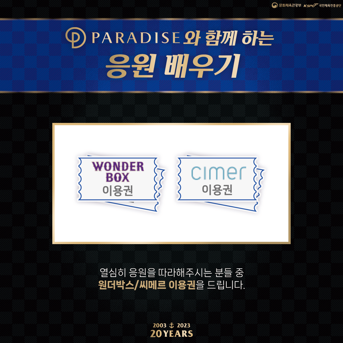 파라다이스시티와 함께 하는 응원배우기에서 열심히 응원을 따라해주시는 분들께는 원더박스 or 씨메르 이용권을 드립니다.