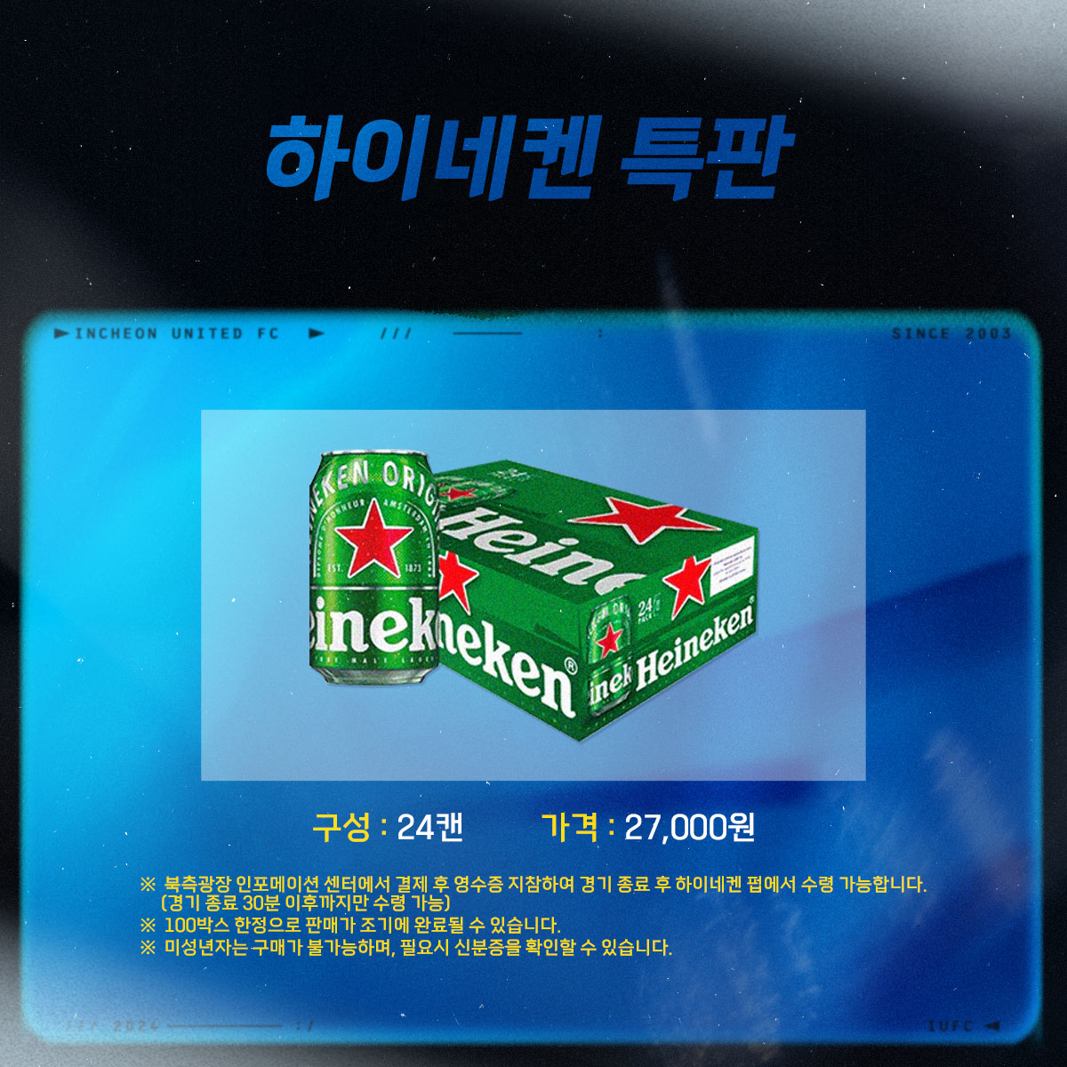 북측광장 인포메이션 센터에서 100박스 한정 하이네켄 특판을 진행합니다. 경기 종료 후 하이네켄 펍에서 수령 가능하며 조기에 판매 완료될 수 있습니다.