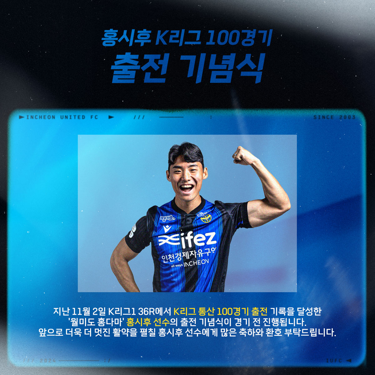 K리그1 36R 전북전에서 K리그1 100경기 출전 기록을 달성한 홍시후 선수의 출전 기념식이 경기 전 진행됩니다.