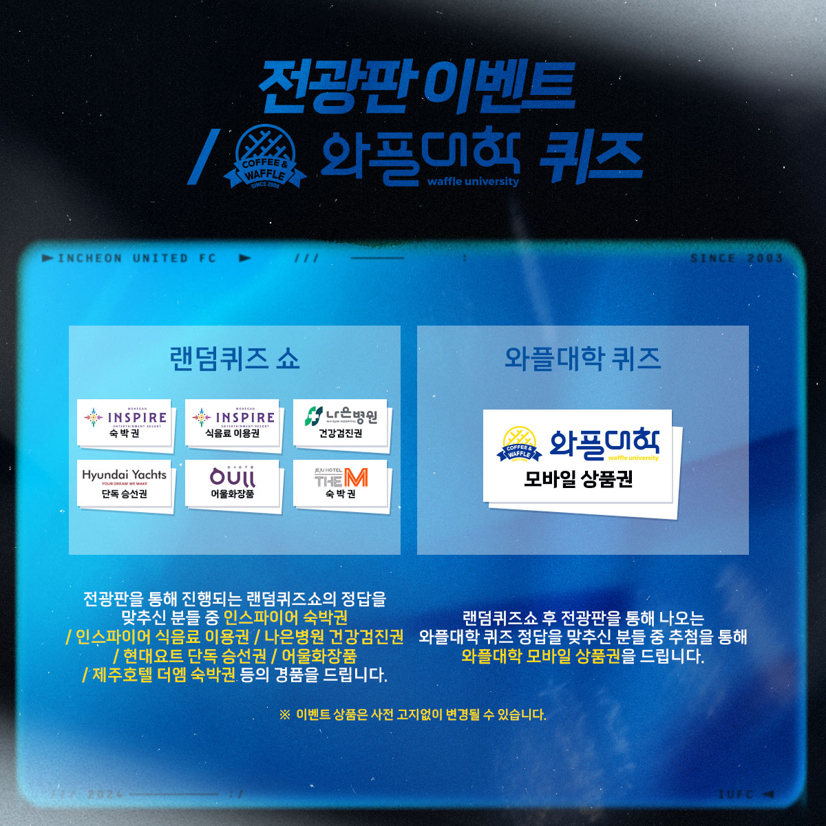 - 인스파이어&현대요트&나은병원&제주호텔&어울화장품&와플대학과 함께 하는 경기 전 전광판 이벤트