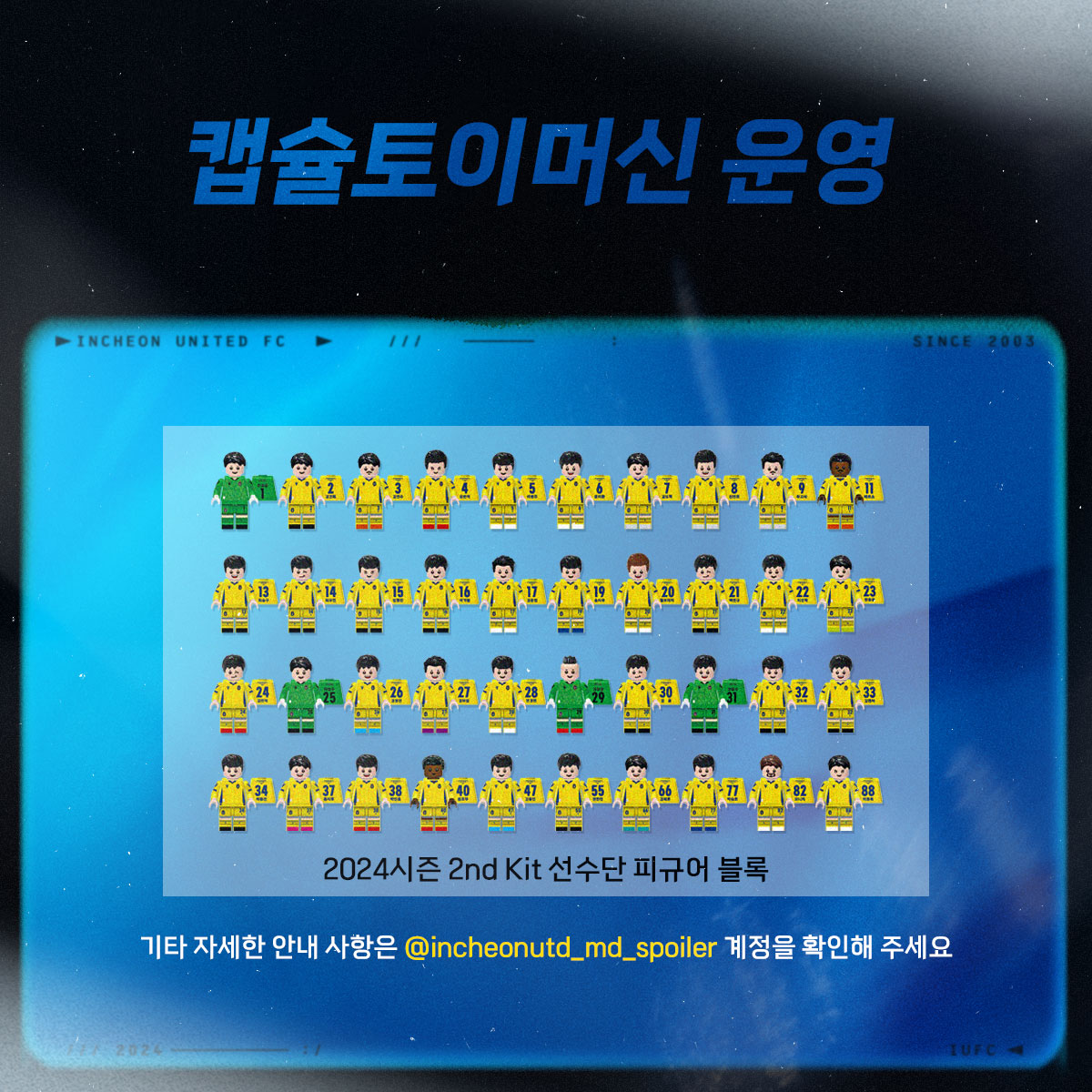 북측광장 미니MD샵에서 2024시즌 2nd Kit 선수단 피큐어 블록 캡슐토이머신을 운영합니다! 자세한 내용은 인스타그램 MD 계정(@incheonutd_md)를 확인해 주세요